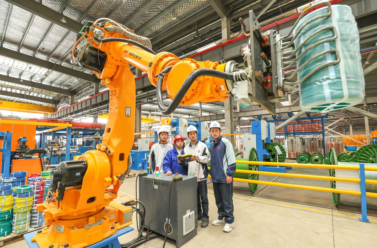 上個月,學生們在中國湖州的一個生產車間學習操作工業機器人。圖片來源:Cfoto/Zuma Press央行稱:“疫情’疤痕效應’尚未消退,居民收入預期仍在恢復,青年人就業壓力較大,消費復甦動能的可持續性面臨挑戰。”