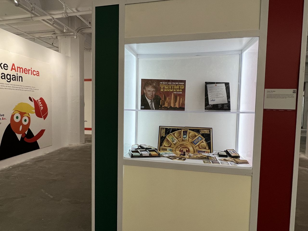 他是如何對待這些展品的?有時帶着嘲諷,尤其在一個名為“讓美國再次失敗”的展覽中,專門展示了一款失敗的棋盤遊戲、一家倒閉的航空公司以及以唐納德·特朗普總統命名的一系列破產度假村。