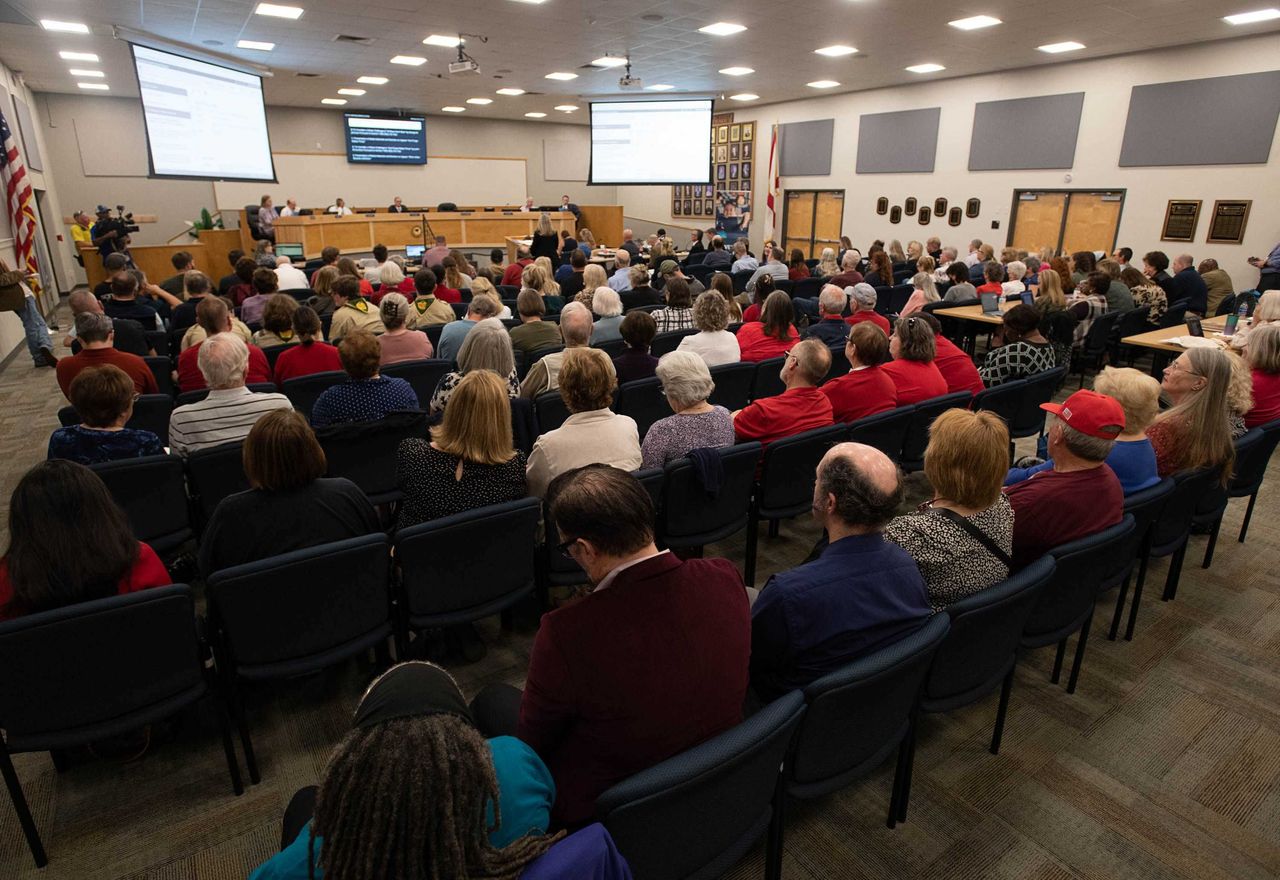 埃斯坎比亞縣學區二月份一場關於禁書《所有男孩都不是藍色的》的公開論壇。圖片來源:Gregg Pachkowski/《彭薩科拉新聞日報》/今日美國網絡圖書出版商企鵝蘭登書屋與倡導組織美國筆會於週三起訴佛羅里達州一個學區,指控其限制涉及LGBT身份及種族議題的圖書館藏書違反憲法。