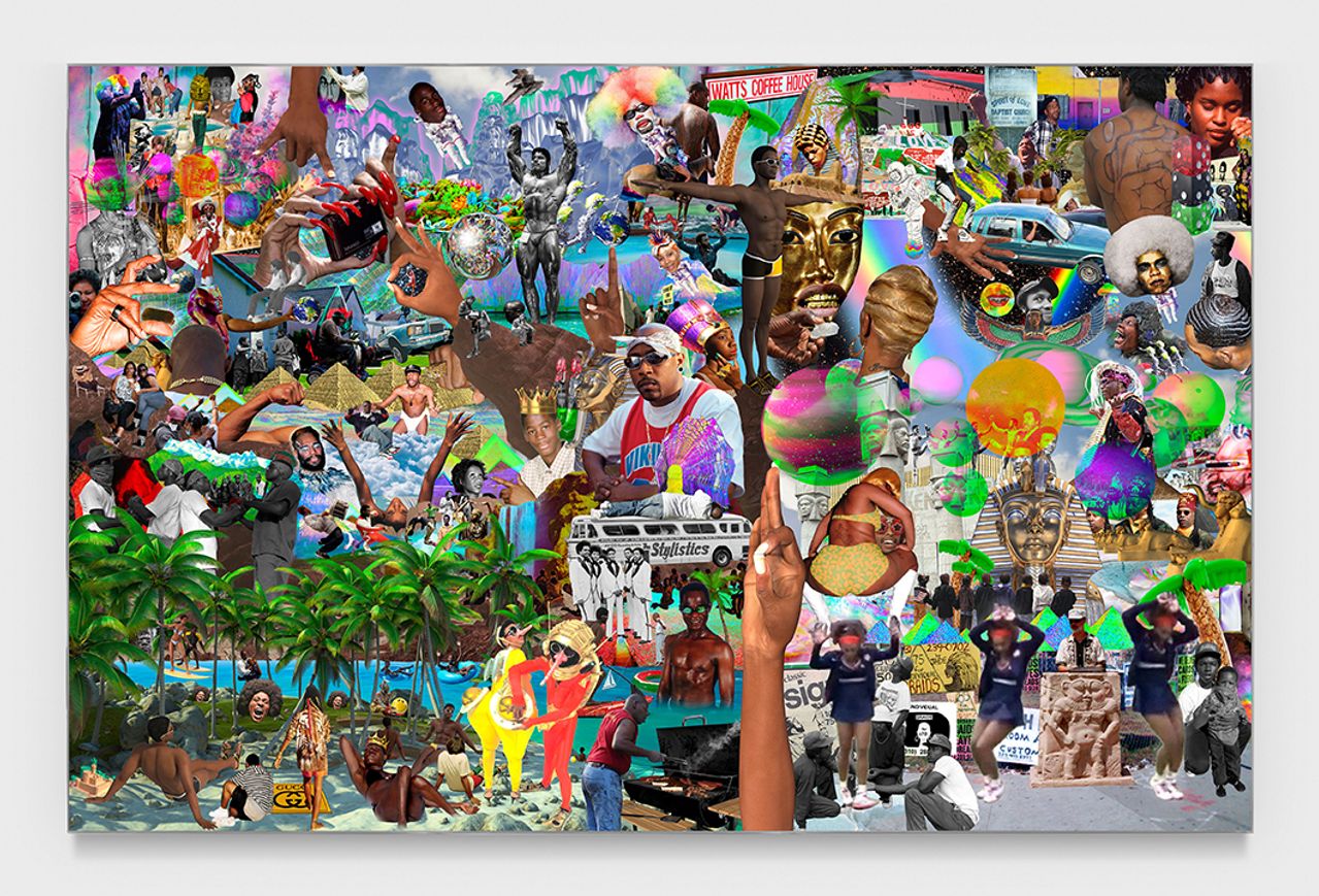 在弗里茲藝術展上,她通過巨幅噴墨印刷品和雕刻石膏牆面作品深化了與當地社區——特別是她家族世代居住的南中央區——的聯結,這些作品既承載着該地區的歷史,又散發着黑人自豪感。前者充滿活力且別具一格,融合了數百幅圖像——部分來自檔案資料,部分出自哈爾西女士的攝影,還有電腦生成元素。最終呈現出一幅跨越時空的彩色畫卷,從古埃及到現代洛杉磯,再到非洲未來主義的星際圖景。後者令人聯想到古埃及浮雕(該文化也是她為大都會博物館創作的核心主題),因其象形文字風格,但內容完全屬於當下,記錄着南中央區的生活活力——健美者展示肌肉,商鋪招牌自豪地宣告黑人所有權。通過這些極致細膩的作品,哈爾西女士繪製出她獨特的歷史視野,讓人不禁為她所分享的版本感到振奮。