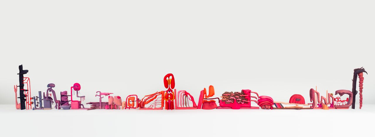 馬修·羅奈作品《裂隙、膨脹、大地、頌歌》,由凱西·卡普蘭在紐約弗里茲藝博會呈現攝影:藝術家/凱西·卡普蘭其他值得關注的個展包括貝浩登呈現的泉和泉作品,那些充滿外星神秘主義的彩繪岩石與畫布;詹姆斯·科漢展位中諾德琳·皮埃爾的繪畫,藉助神話與宗教探索靈性、靈魂掙扎與來世;膠囊上海集結的廖雯雕塑,將藝術家人體模型與賽博格混搭;以及凱西·卡普蘭展出的馬修·羅奈單體雕塑——一件手工雕刻的染色木材製成的長形無定形作品,其形態遊走於器官、人體、海洋生物等多種意象之間。