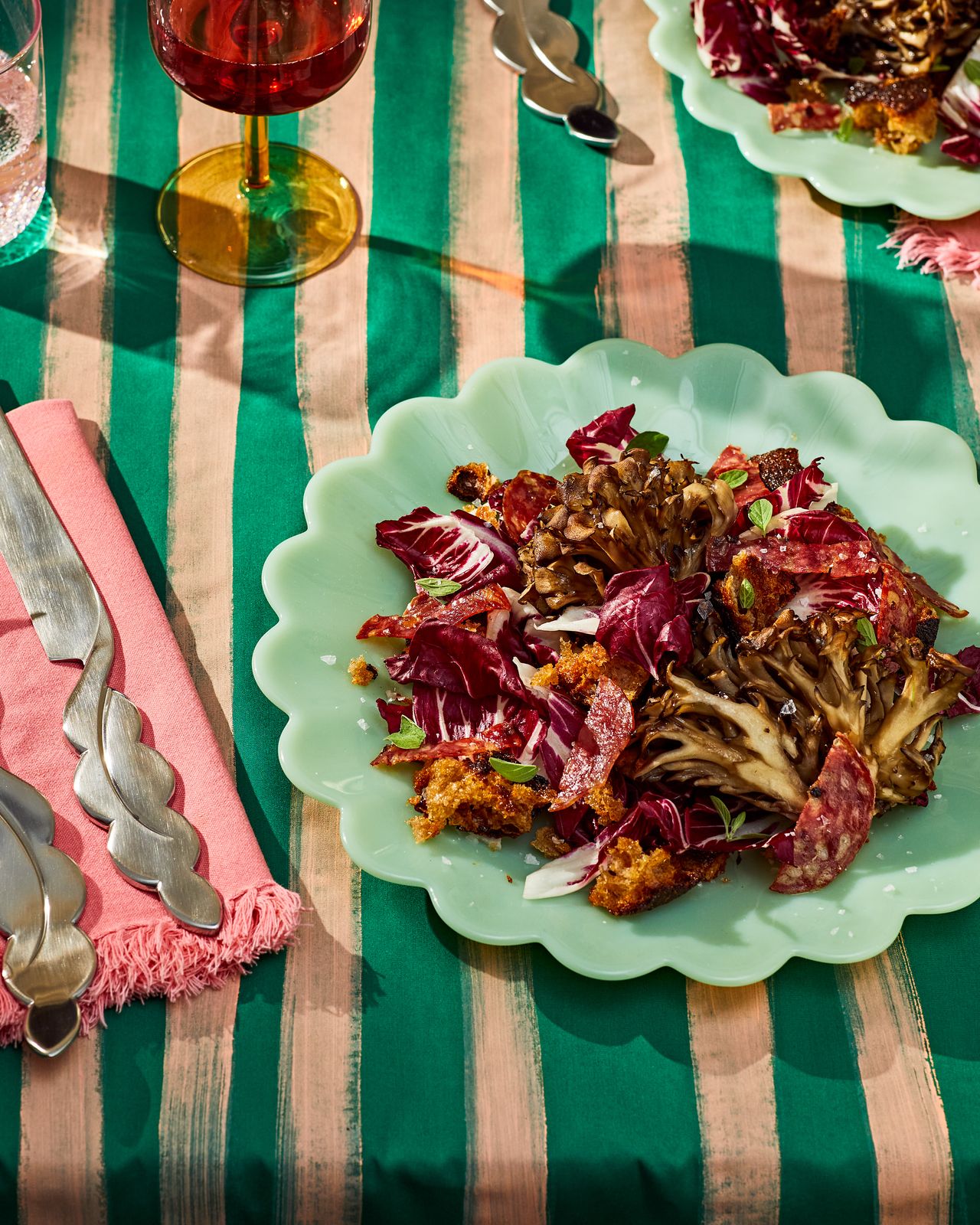 肉質飽滿的舞茸菇有着美妙的褶皺邊緣,烤制後酥脆可口。最後淋上加入辣味意式臘腸和香草酸麪包丁的熱油醋汁。點擊此處獲取食譜。