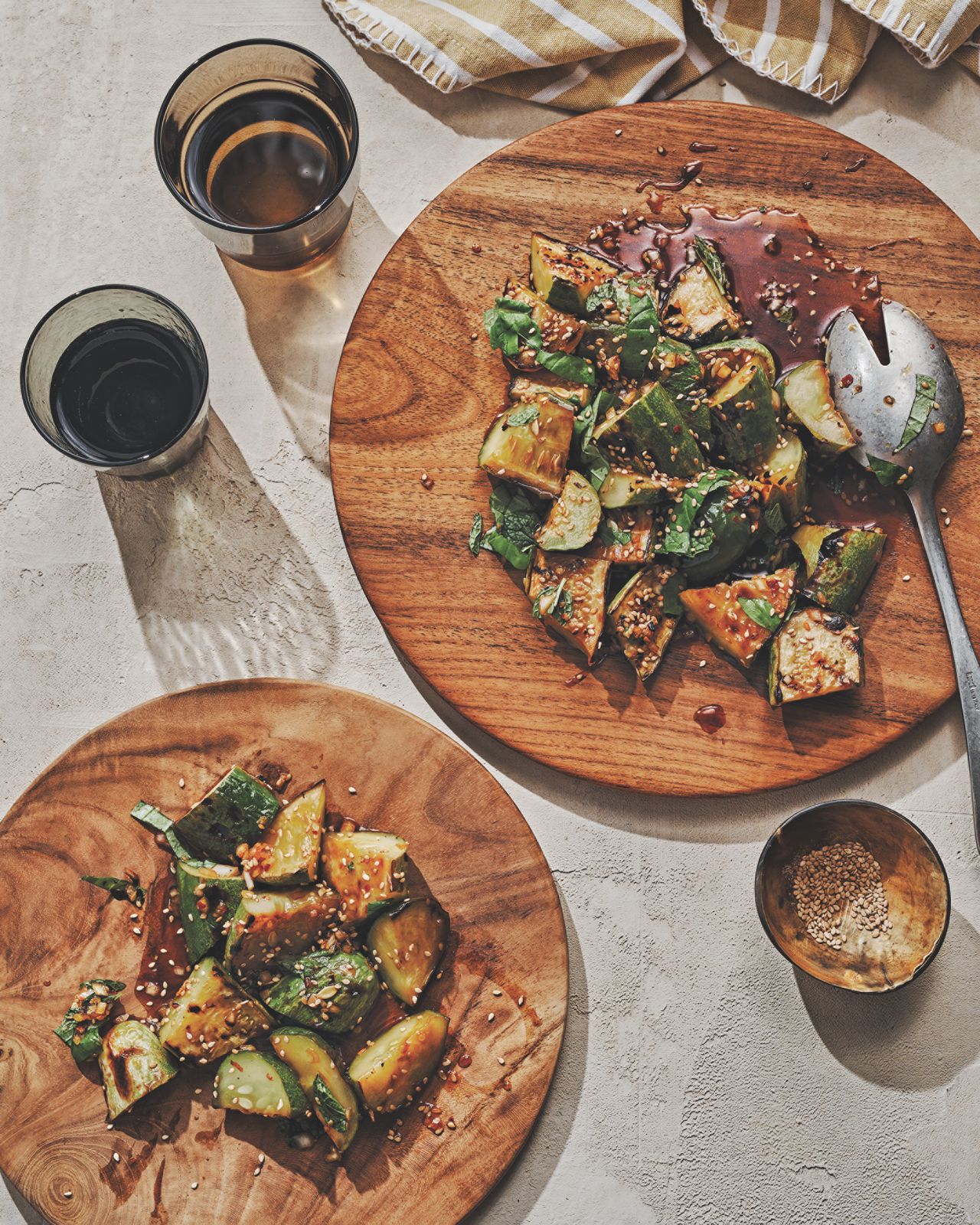 恰到好處的焦痕為清涼的黃瓜帶來令人驚喜的濃郁風味。用醬油、米醋、蜂蜜和紅辣椒片調製的醃料為其增添了幾分衝擊力。點擊此處獲取食譜。