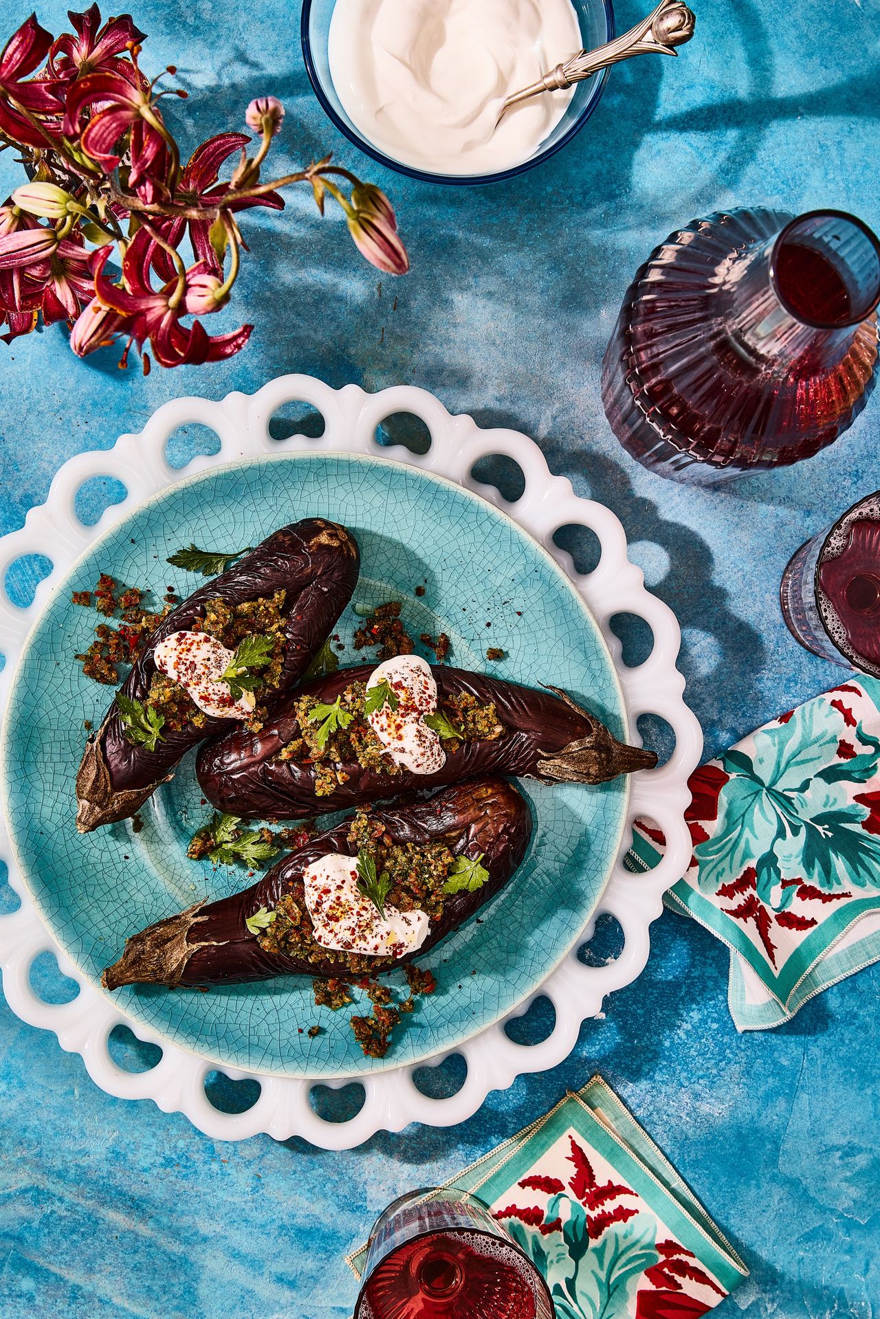 埃茲梅醬——這種由番茄碎、辣椒和香草製成的土耳其醬料,與煙燻炭烤茄子相得益彰。蓬鬆的檸檬酸奶醬則提供了清涼的對比。點擊此處獲取食譜。