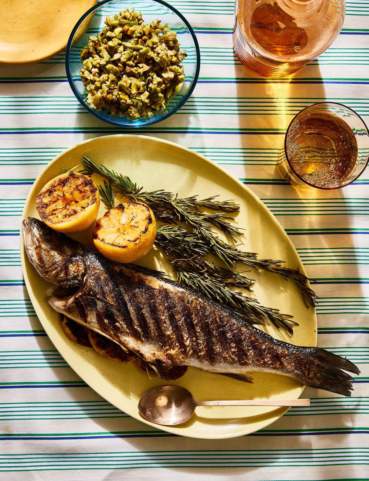 帶有燒烤紋路的整條海鱸魚堪稱優雅盛宴。搭配鹹鮮檸檬風味的橄欖開心果莎莎醬,這道快捷簡單的菜餚令人無法抗拒。