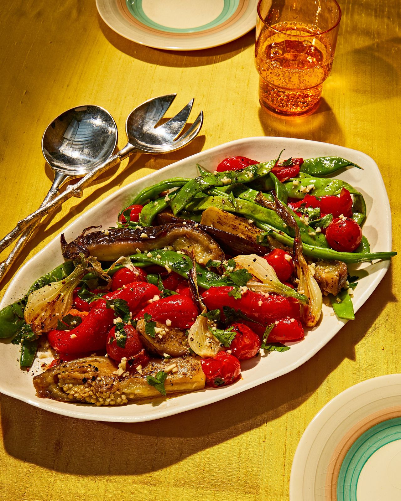 羅馬豆、紅椒條、茄子、洋葱和小番茄經過炭烤後,拌入風味十足的蒜香醋汁,組成一道令人驚豔的美味佳餚。點擊此處獲取食譜。