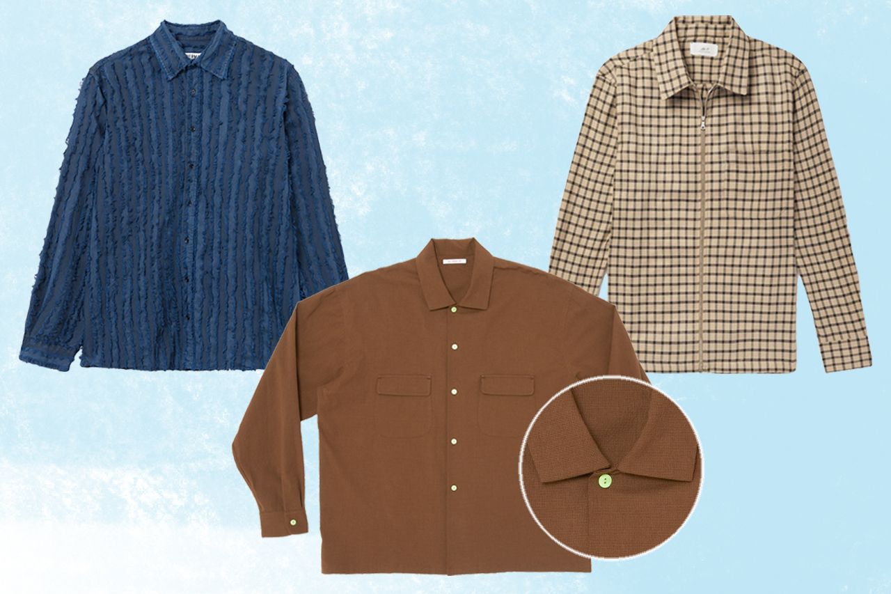 從左至右:流蘇亞麻襯衫,300美元,Schnaydermans.com;綠色貝殼紐扣褶皺棉襯衫,360美元,SKManorHill.com;格紋羊毛混紡拉鍊外套襯衫,255美元,MrPorter.com