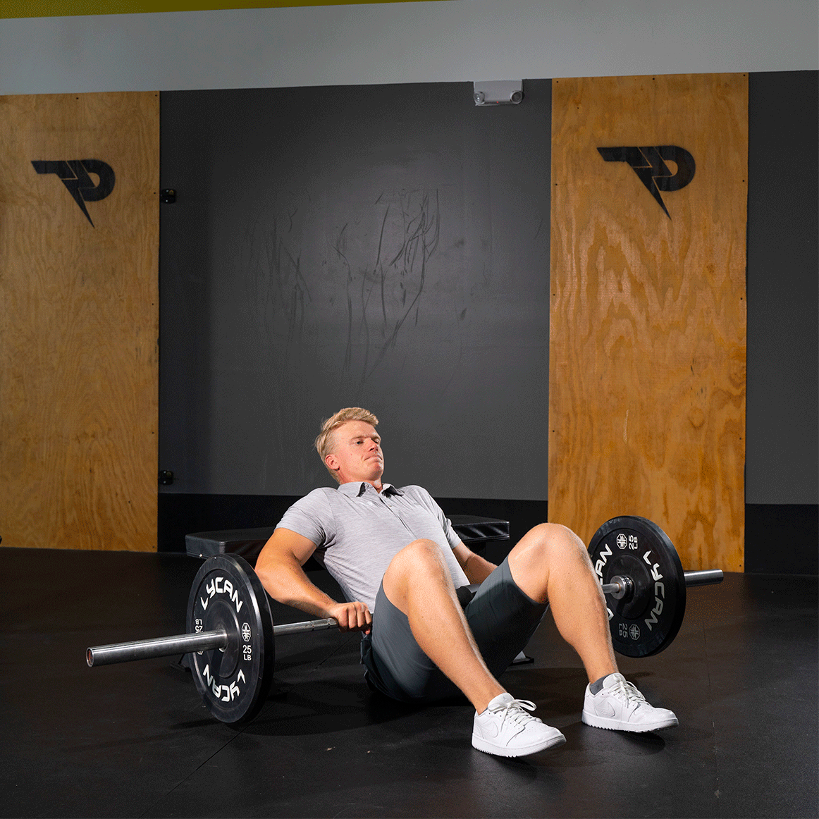 帕裏什演示如何用槓鈴進行負重臀推。### 反向弓步