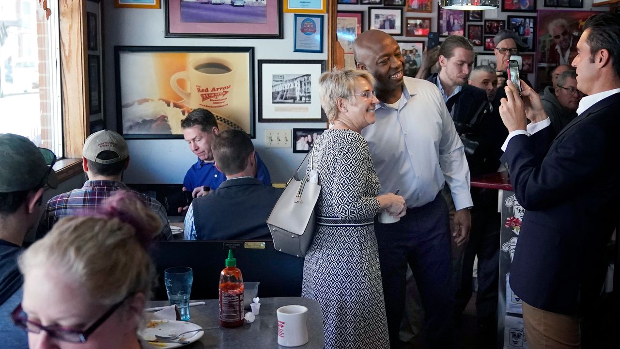 蒂姆·斯科特上月造訪新罕布什爾州曼徹斯特紅箭餐廳,這些關鍵州份將決定共和黨提名歸屬。圖片來源:查爾斯·克魯帕/美聯社據助手透露,作為籌款能手的斯科特以2200萬美元現金啓動競選,並預定了近600萬美元廣告在艾奧瓦州和新罕布什爾州競選啓動後投放。截至3月底聯邦選舉委員會最新文件顯示特朗普手握1400萬美元資金。