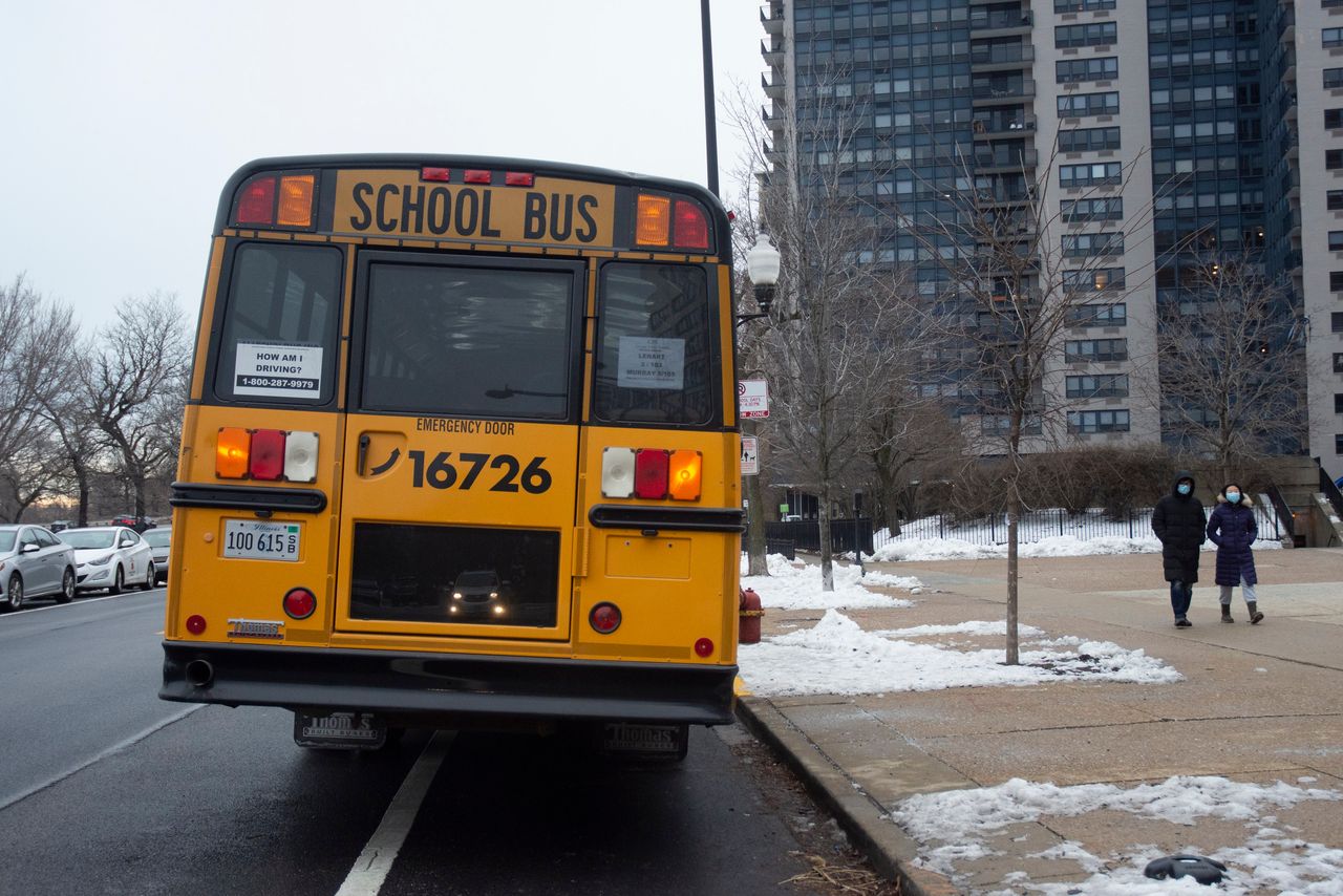 芝加哥的校車。圖片來源:Karen I. Hirsch/Zuma Press刊載於2023年5月24日印刷版,標題為《伊利諾伊州還會"投資兒童"嗎?》。