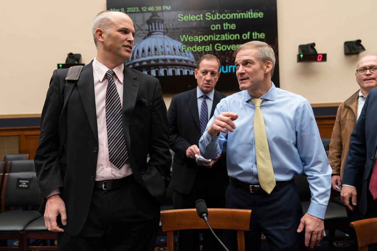 3月9日華盛頓,眾議院司法委員會聽證會結束後,吉姆·喬丹議員與馬特·泰比交談。照片:Manuel Balce Ceneta/美聯社刊登於2023年5月26日印刷版,標題為’國税局需要的是籠子,而非更多資金’。