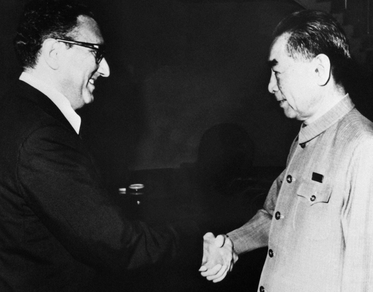 1971年7月9日,亨利·基辛格在北京會晤期間與中國總理周恩來握手。圖片來源:-/法新社/蓋蒂圖片社刊載於2023年5月27日印刷版,標題為《百歲基辛格發出的警示》。