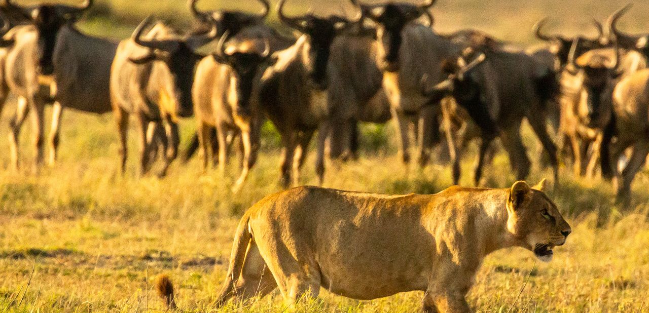 一羣角馬正監視着一頭母獅。圖片來源:約瑟夫·麥克唐納/蓋蒂圖片社大衞·奎曼在《野性心跳》中提醒我們,荒野必須具有多樣性。一片松樹林構不成森林,一潭死水和幾株香蒲也形不成沼澤。要成為真正的荒野,維持書中標題隱喻的心跳,一個生態系統必須滋養無數動植物物種,維繫光合作用、授粉、競爭與捕食等關鍵自然過程網絡。否則心跳就會停止,荒野隨之消亡。