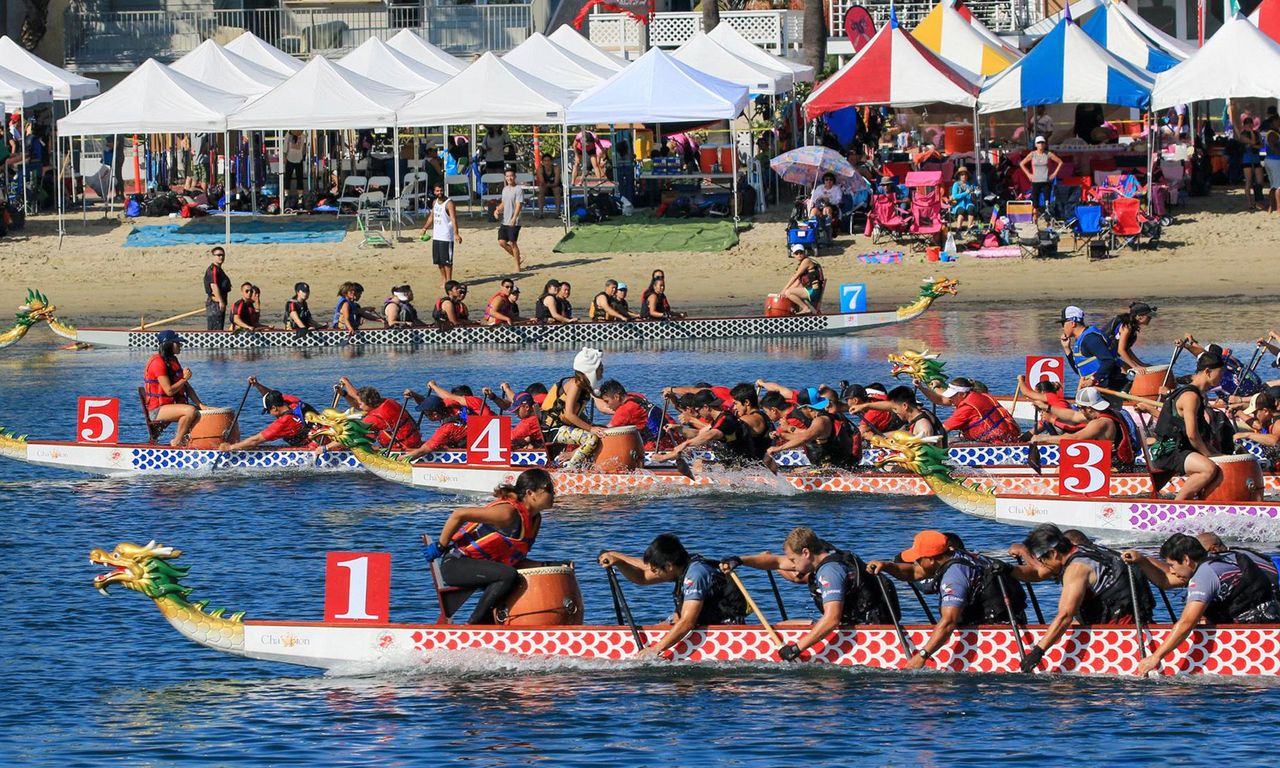 在加利福尼亞州長灘,龍舟節在海洋體育場舉行。照片:克里斯·西爾維斯特### 龍舟與瑪麗皇后號