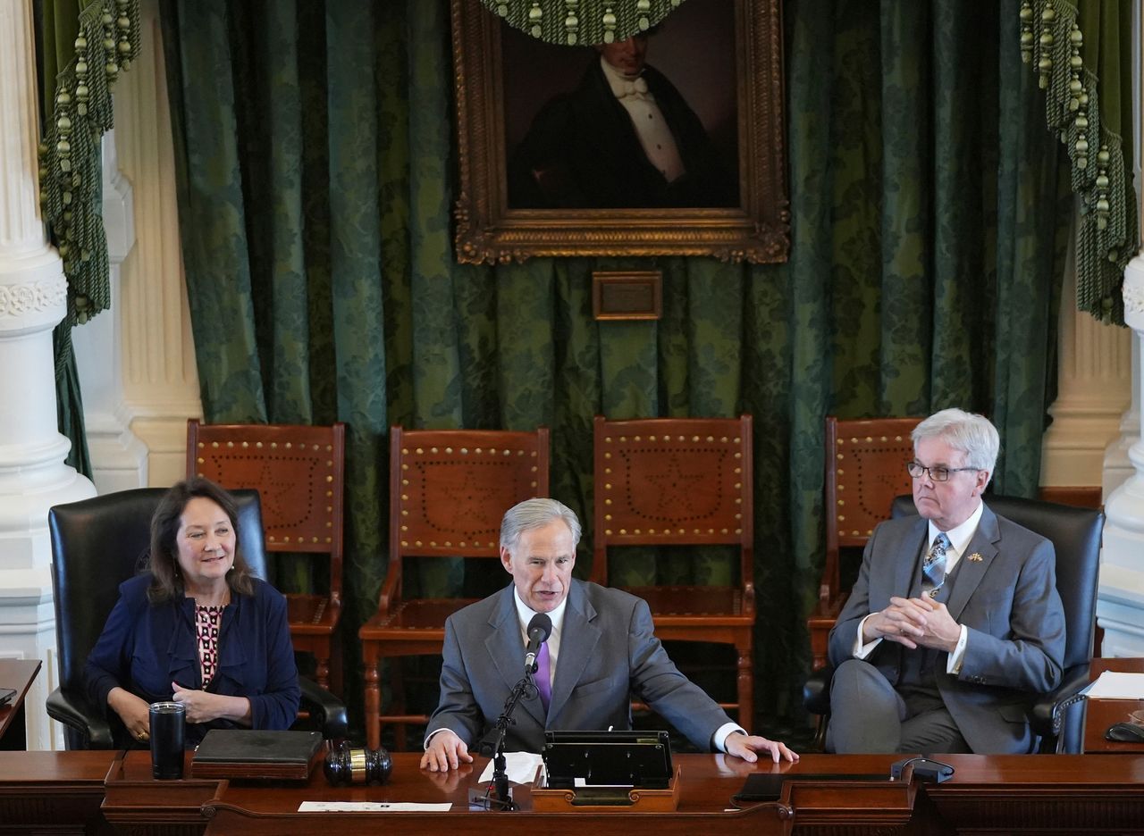 得州州長格雷格·阿博特(Greg Abbott)(中)在最新一屆立法會議開始時向州參議院發表講話,第一夫人塞西莉亞·阿博特(Cecilia Abbott)和副州長丹·帕特里克(Dan Patrick)在一旁聆聽。照片:傑伊·詹納/奧斯汀美國政治家報/美聯社風能和太陽能在德克薩斯州的電力供應中佔比已達31%,正逐步逼近佔比43%的天然氣。由於無法與天然氣競爭或可再生能源建設成本驟降,多家燃煤電廠已關閉,這進一步推動了綠色投資熱潮。