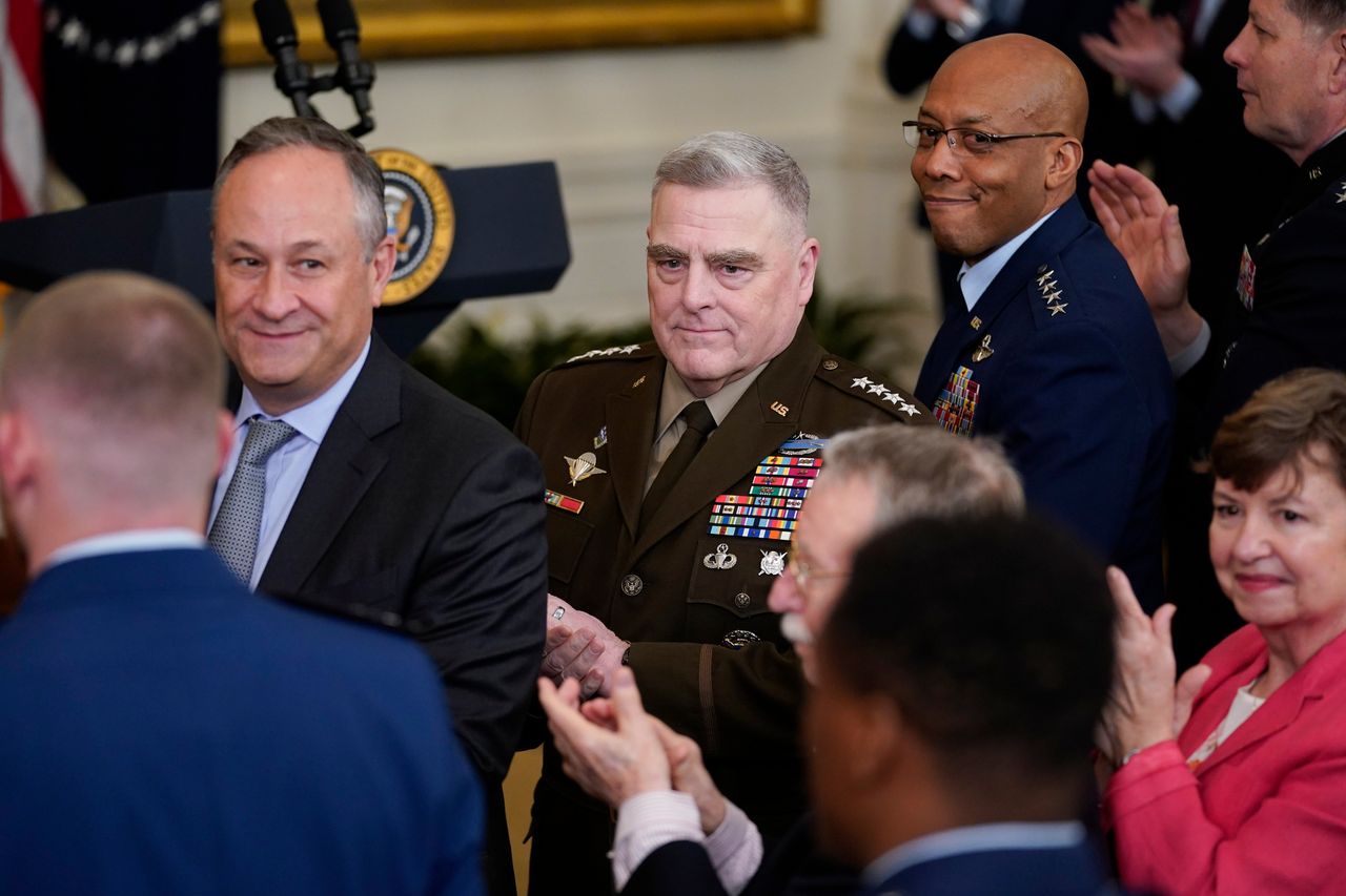 上月白宮活動中,佩戴眼鏡的參謀長聯席會議主席馬克·米利將軍與小查爾斯·Q·布朗將軍。圖片來源:Evan Vucci/Associated Press去年夏天布朗曾引發轟動,當時他建議美國應開始培訓烏克蘭飛行員駕駛F-16戰鬥機,而這一政策決定直到上週才由拜登宣佈實施。