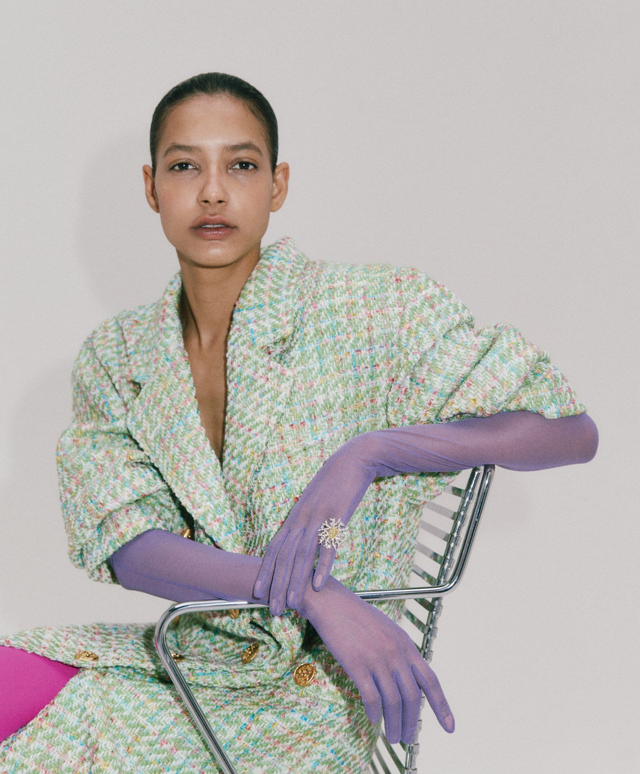 酸性色粉彩與宣言戒指相得益彰。蒂芙尼高級珠寶戒指,價格請諮詢,更多信息請訪問Tiffany.com,古馳外套,4,600美元,手套,730美元,緊身褲,290美元,Gucci.com。