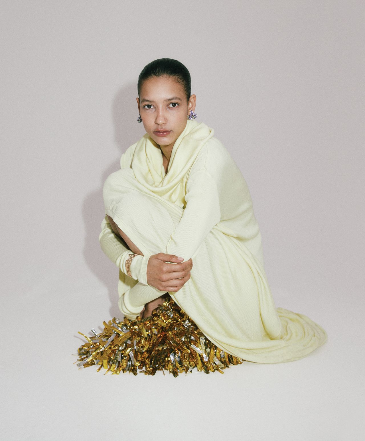 蕭邦高級珠寶耳環,價格請諮詢,項鍊19,500美元,更多信息請訪問Chopard.com,Loewe連衣裙2,500美元,鞋子價格請諮詢,類似款式請訪問Loewe.com。模特MJ Herrera來自One Management;髮型,Marki Shkreli;化妝,Rei Tajima;美甲,Elina Ogawa;製作,De Facto。