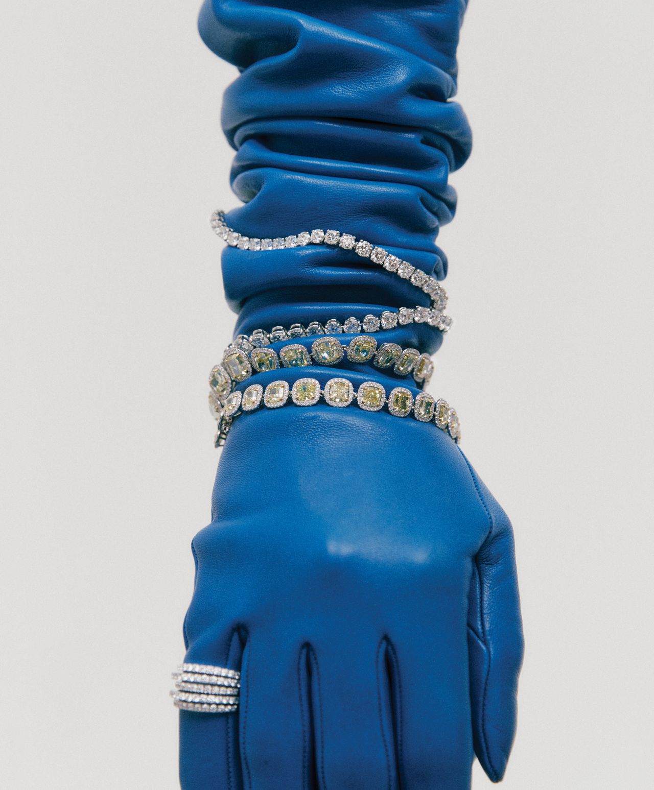 用層層克拉大膽下注。戴比爾斯高級珠寶項鍊(可作手鍊佩戴)及戒指,價格請諮詢,DeBeers.com,亞歷山大·麥昆手套,940美元/雙,AlexanderMcQueen.com。