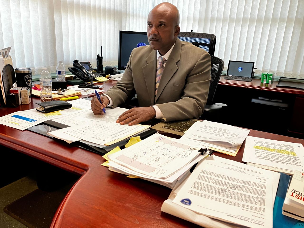 安條克警察局長史蒂文·福特表示,他希望通過舉行更多社區會議和招聘可以適當培訓的新警官來重新贏得城市的信任。照片:Zusha Elinson/華爾街日報福特表示,由於這些種族主義短信,約20名警官和警長已被停職。他説,在決定是否解僱他們之前,他正在等待外部調查的結果。