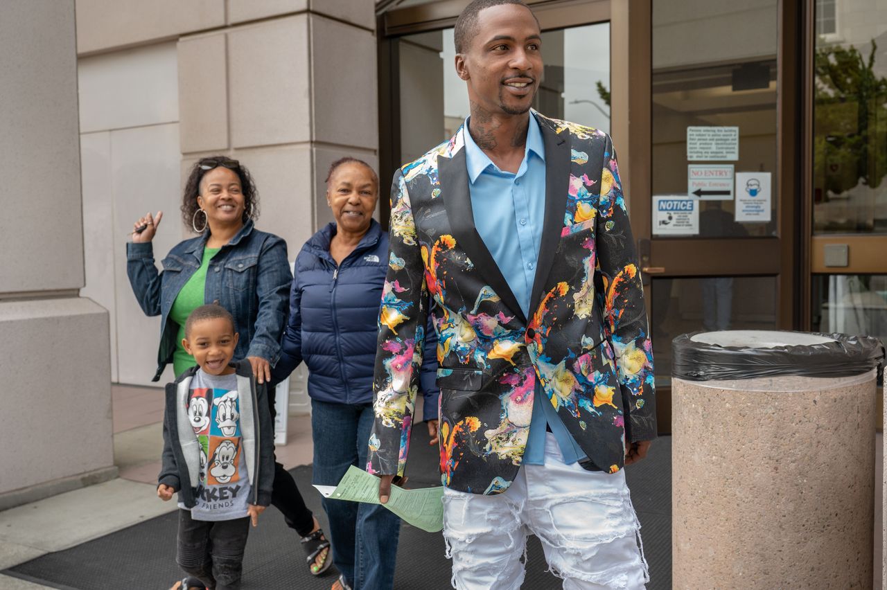 本週在加州安條克,亞當·卡彭特與母親、妹妹和兒子離開法庭,針對他的指控已被撤銷。