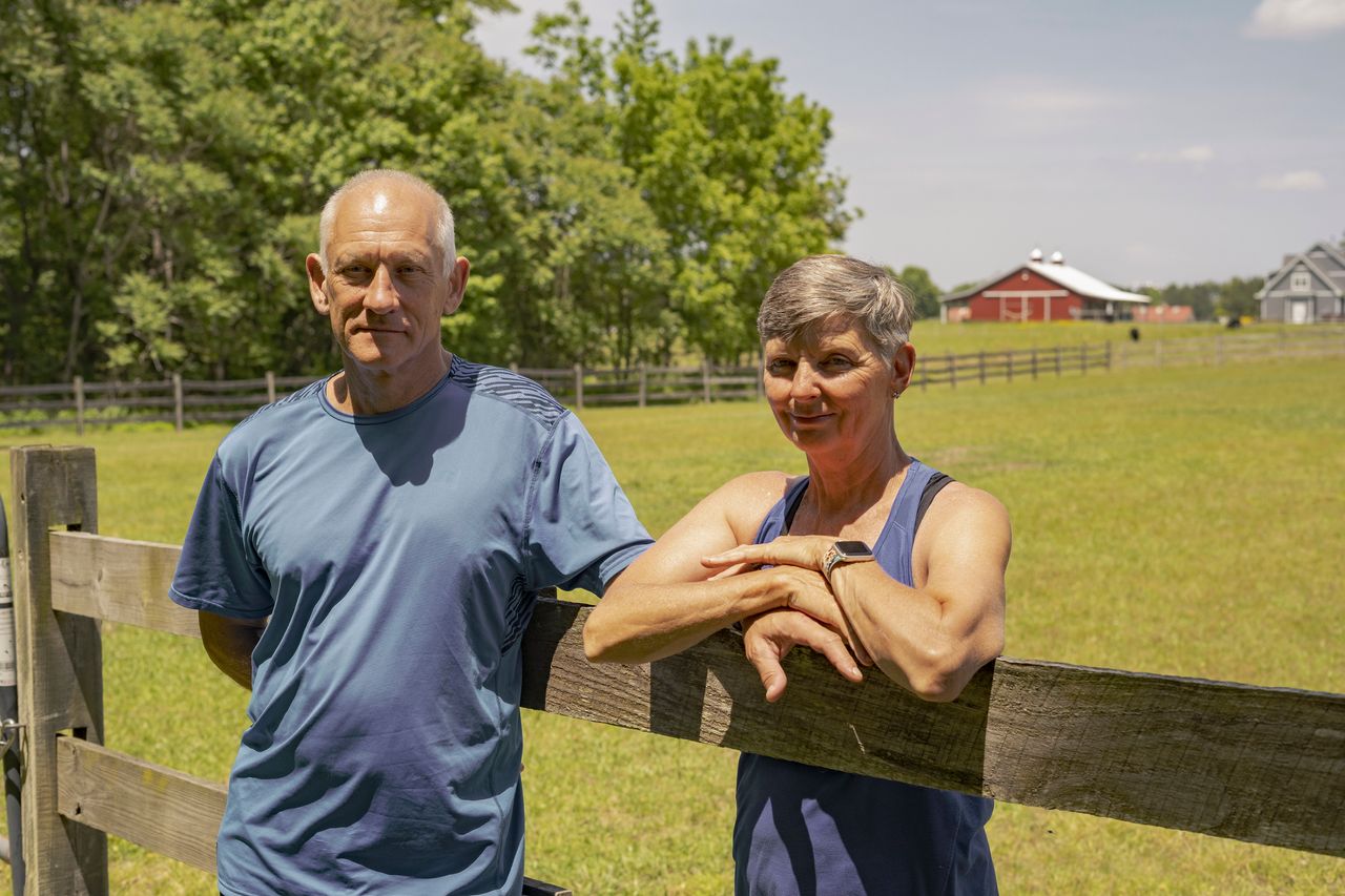 66歲的戴夫和61歲的朗達居住在弗吉尼亞州託阿諾的一個農場。兩人都有耐力運動背景。相識時,她是跑步愛好者,他是自行車手。戴夫很快也愛上了跑步,在參加"騎綁賽"前,這對夫婦曾共同挑戰過超級馬拉松。戴夫的騎綁賽里程已超過3400英里,朗達則完成了3300英里。