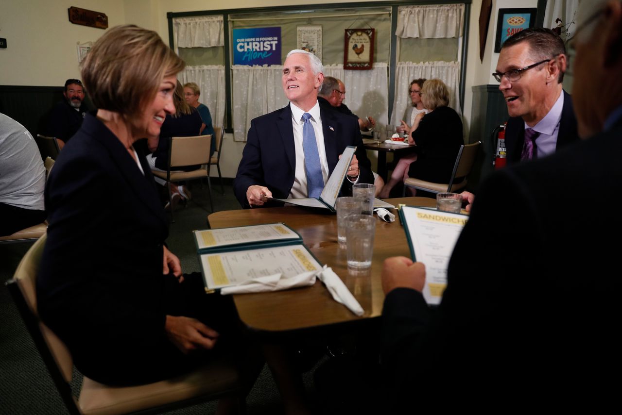 2020年金·雷諾茲州長與副總統邁克·彭斯在愛荷華州福里斯特城的午餐會,彭斯稱她為公正協調人。圖片來源:Charlie Neibergall/美聯社雷諾茲今年推動通過的學券計劃,是在前兩次嘗試失敗後實現的,其中包括來自農村地區一些共和黨人的反對,這些地區的私立學校較少。