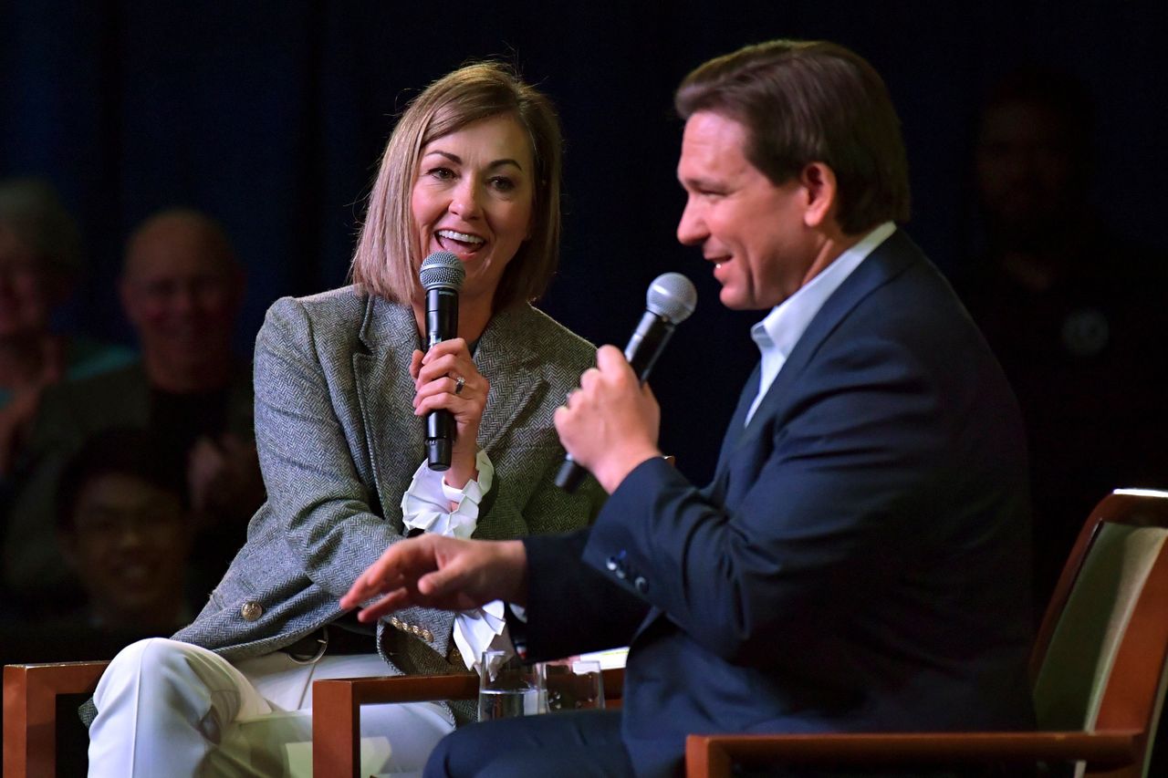 佛羅里達州州長羅恩·德桑蒂斯和艾奧瓦州州長金·雷諾茲在今年早些時候的一場活動上。圖片來源:Ron Johnson/Associated Press雷諾茲2022年在艾奧瓦州的勝選優勢略小於德桑蒂斯創下的19個百分點,今年她推動共和黨控制的州議會通過了一項與他所獲成果同樣保守的議程。