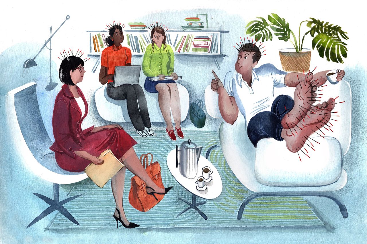 針灸師從我的一個助理開始,然後是另一個,最後輪到我。所有針都一根接一根地紮在我的頭頂。我一點也不喜歡針——我甚至不喜歡抽血——但這次幾乎沒什麼感覺。