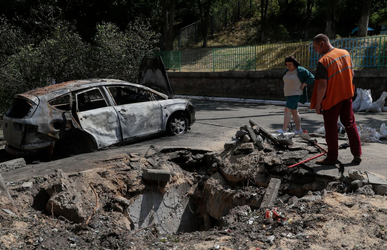 烏克蘭基輔一棟公寓樓外,墜落殘骸在地面砸出大坑。圖片來源:Sergey Dolzhenko/EPA/Shutterstock