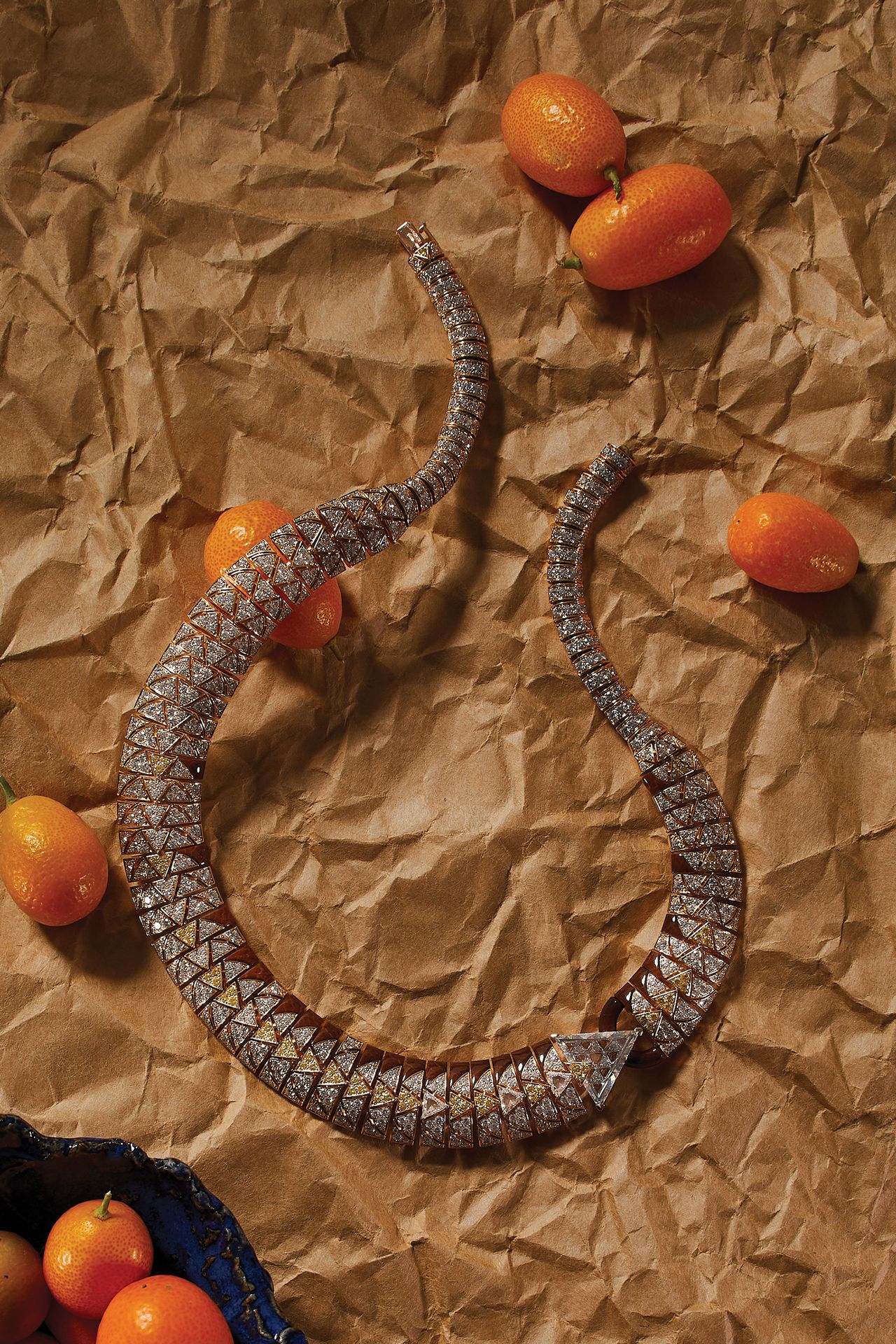 卡地亞高級珠寶項鍊,價格請諮詢,精選卡地亞精品店。攝影:F·馬丁·拉明 | 道具造型:塔尼婭·莫斯科維茨作為皇權的象徵與毒液的來源,尼羅河地區的蛇類——角蝰,是一種充滿神秘色彩的生物。這種蜿蜒的生物激發了卡地亞全新高級珠寶系列"沙地角蝰"的創作靈感。項鍊以三角形元素構成,呼應蛇鱗紋理。一顆重達3.63克拉的三角形玫瑰切工鑽石象徵毒蛇之首,其餘部分則由鑲嵌於玫瑰金中的黃鑽與白鑽組成,並輔以石化木鑲嵌,幻化出蛇皮般的波紋光澤。——珍妮·哈特曼