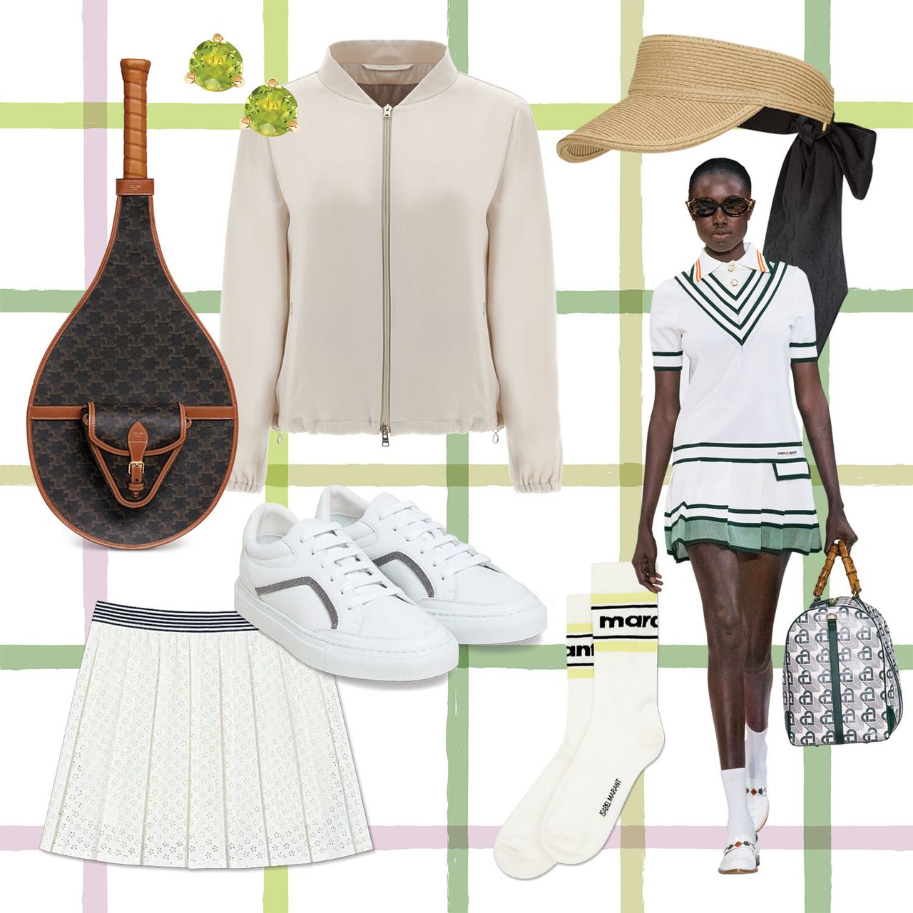 從左上方順時針方向:Hedi Slimane設計的Celine網球套裝,4,100美元,Celine.com;Misahara耳釘,每隻155美元,Misahara.com;Herno夾克,815美元,Herno.com;Anthony Vaccarello設計的Saint Laurent遮陽帽,795美元,YSL.com;Isabel Marant襪子,85美元,IsabelMarant.com;Brunello Cucinelli運動鞋,1,095美元,Shop.BrunelloCucinelli.com;Tory Sport裙子,168美元,ToryBurch.com。