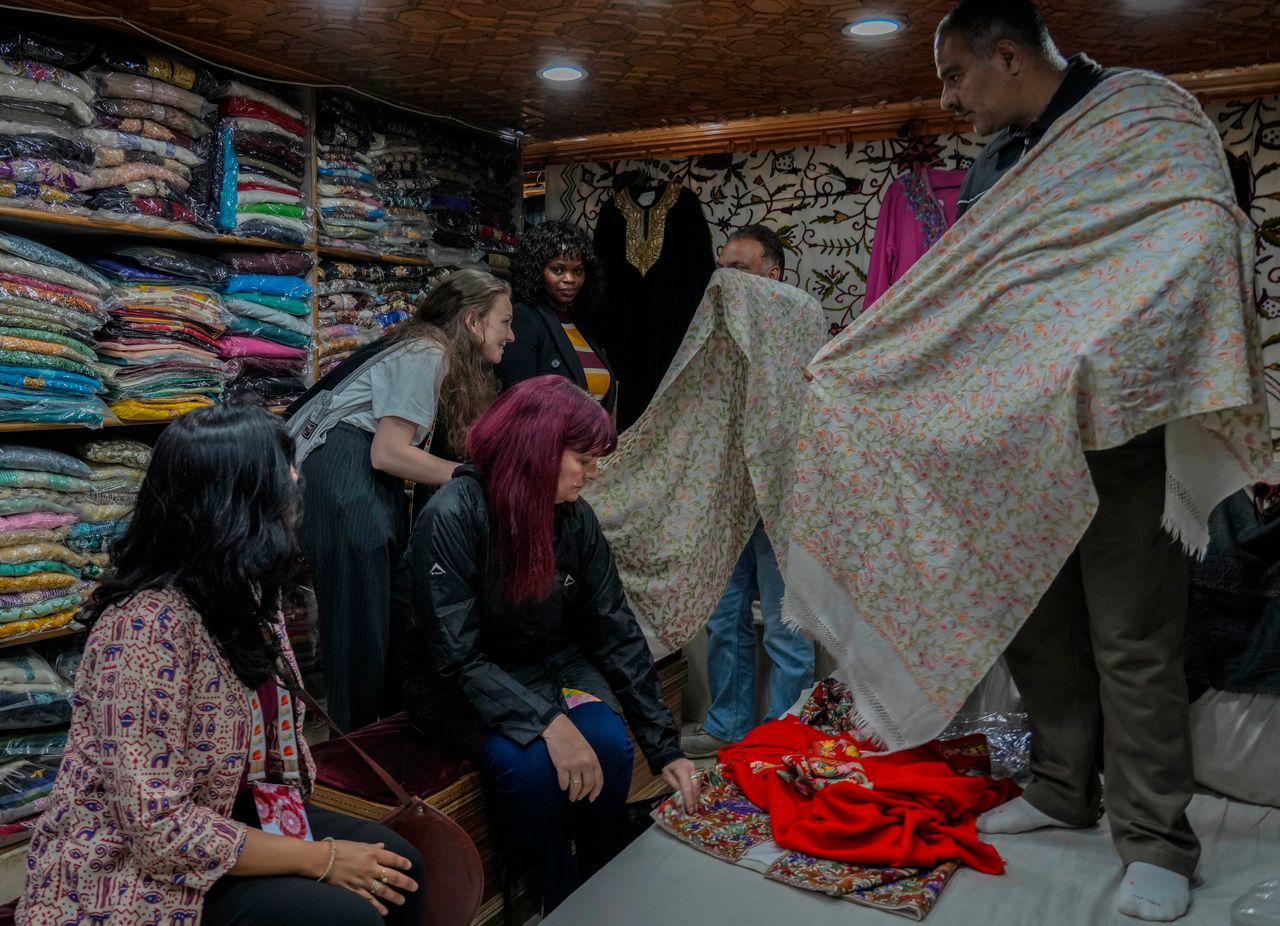斯利那加的克什米爾店主向遊客展示當地著名的羊絨披肩。圖片來源:Mukhtar Khan/Associated Press歷年的封鎖和宵禁擾亂了商業活動,包括2019年新德里直接管轄該地區後實施的民主國家中最久的互聯網關閉。