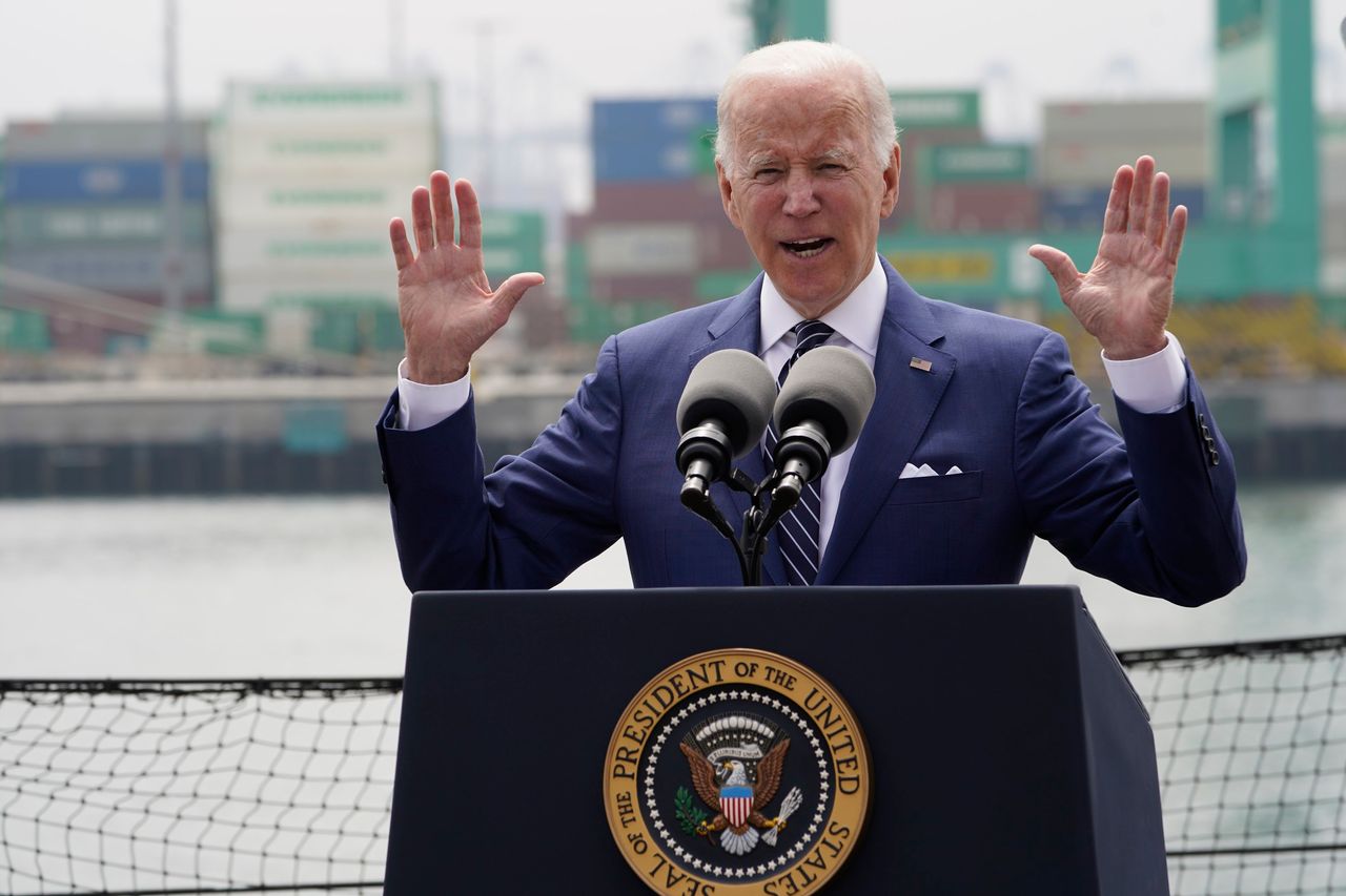 2022年6月10日,喬·拜登總統在洛杉磯港發表講話。圖片來源:Damian Dovarganes/美聯社刊載於2023年6月14日印刷版,標題為《通脹是拜登的選舉逆風》。
