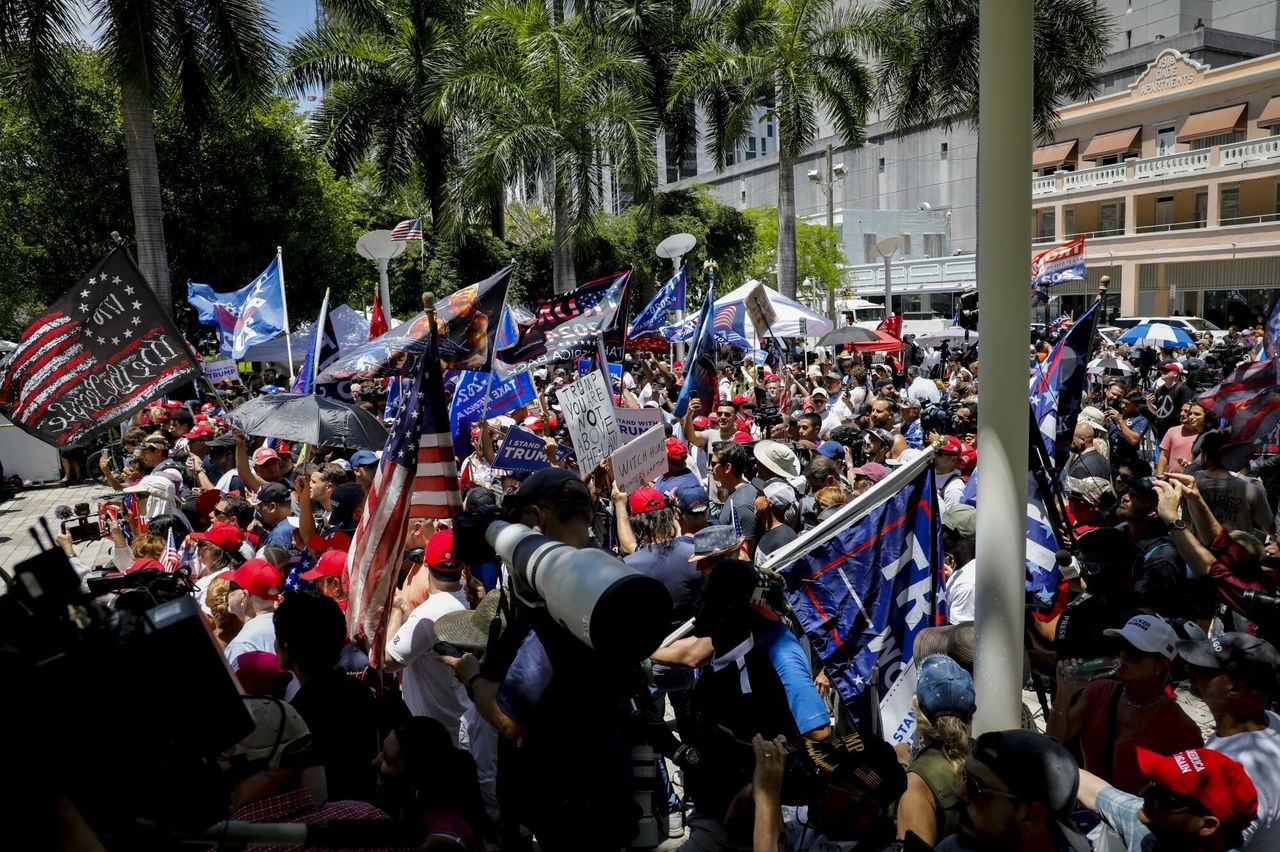 週二,前總統唐納德·特朗普的支持者在邁阿密威爾基·D·弗格森小法院外。圖片來源:Eva Marie Uzcategui/Bloomberg News特朗普對所有37項指控均表示不認罪,這些指控包括七項不同的罪名,包括故意保留國防信息、扣留記錄、虛假陳述和共謀妨礙司法公正。所有這些都與他在法院以北約70英里的海湖莊園處理文件有關。