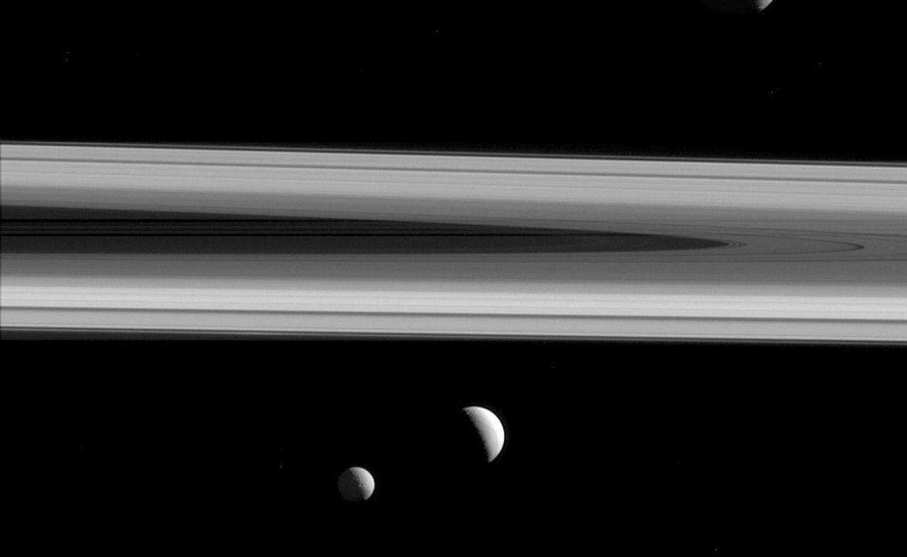 卡西尼號探測器拍攝的圖像顯示了土星的三顆衞星:上方的特提斯、中央的恩克拉多斯和米瑪斯。圖片來源:NASA/JPL-Caltech/Space Science Institute/AP“E環就像是土星的一個幽靈環,”格萊恩説,並補充説它比其他更明亮的行星環更為彌散。卡西尼號的一個儀器——宇宙塵埃分析儀,記錄了探測器在穿過E環和恩克拉多斯的羽流時遇到的單個微小冰粒的組成。