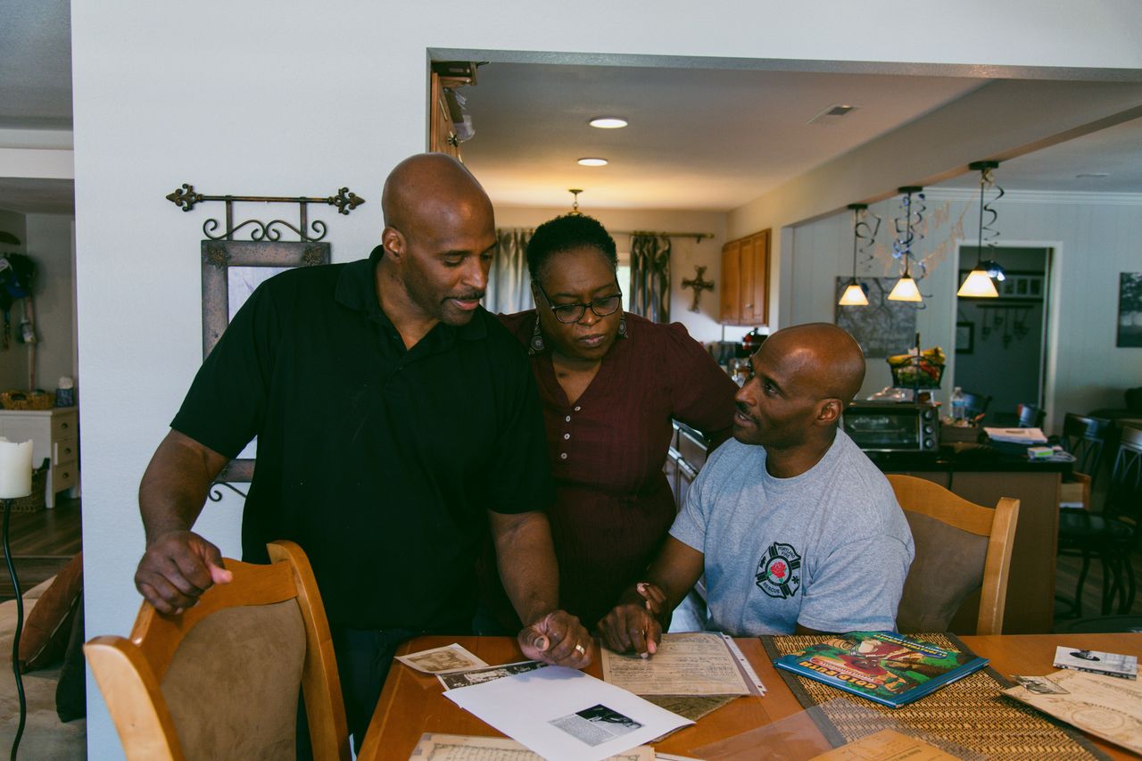 兄弟姐妹馬修·伯吉斯、託尼亞·伯吉斯和喬納森·伯吉斯(坐姿)正在翻閲家族文件和照片。