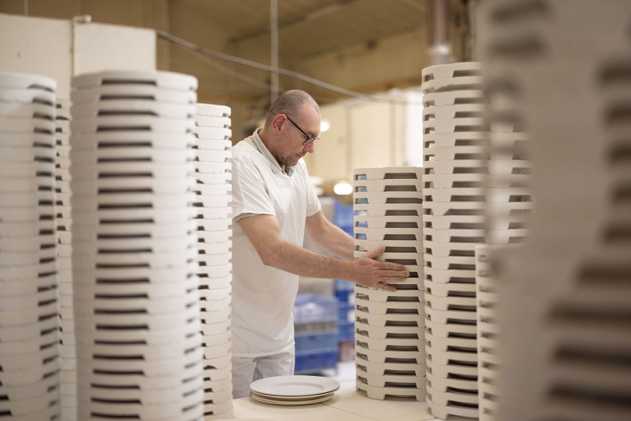 2023年4月17日週一,英國斯托克城Halcyon Days Ltd.工廠內,一名工人正在碼放待入窯燒製的精細骨瓷。圖片來源:Jason Alden/彭博新聞社受服務業改善推動,英國經濟4月實現增長,但頑固的高通脹和英國央行加息可能抑制今年剩餘時間的復甦勢頭。