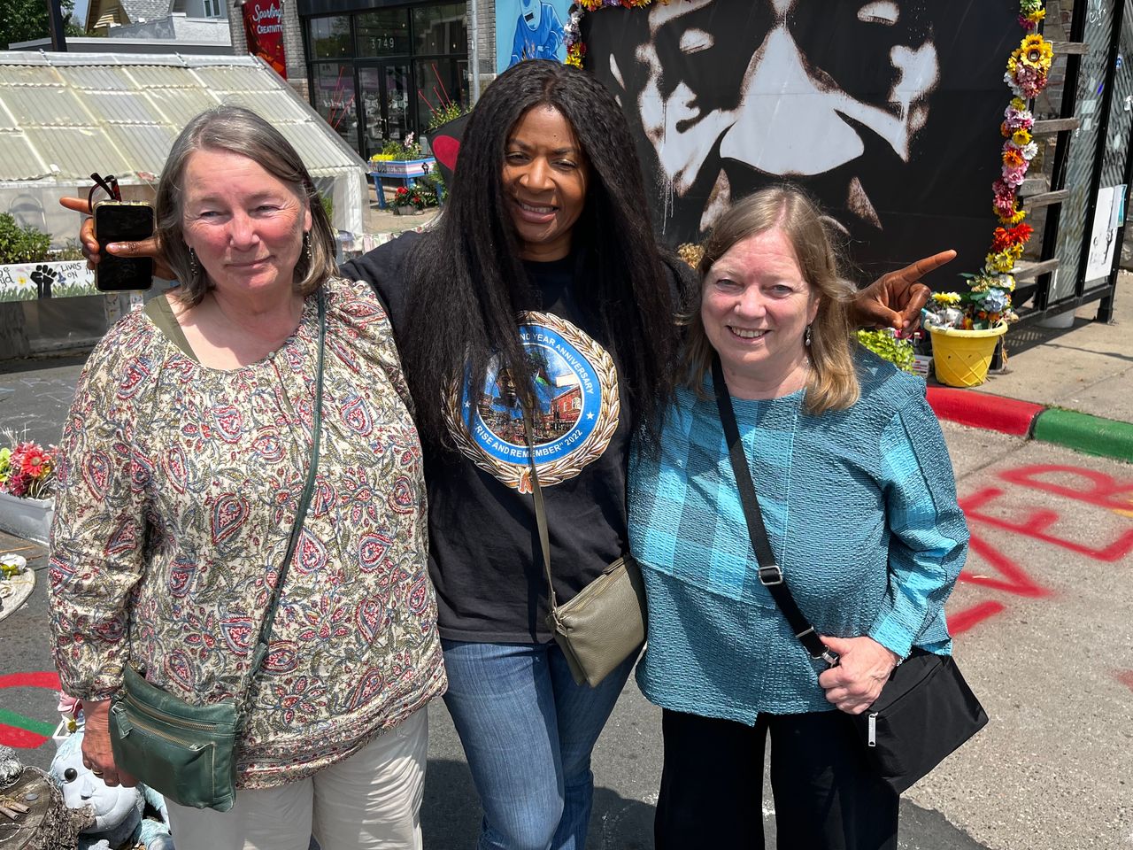 喬治·弗洛伊德的姑媽週五與兩位從外地前來明尼阿波利斯市喬治·弗洛伊德廣場的女性會面。圖片來源:喬·巴雷特/華爾街日報著名社會正義活動家內基馬·利維·阿姆斯特朗表示,她對公職人員被追究責任感到欣慰。“我們沒有安全感,“她説,“我們對這個系統或這些人毫無信任,因為他們一次又一次地讓我們失望。”