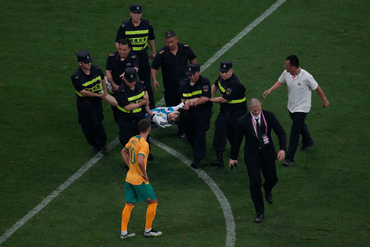 這一出格行為發生在週四阿根廷對澳大利亞的友誼賽期間。視頻迅速在中國社交媒體上瘋傳,視頻顯示邸某衝入球場,短暫擁抱了梅西,並與阿根廷隊門將埃米利亞諾·馬丁內斯擊掌,同時躲過了多名安保人員。可以聽到在他奔跑時球迷為他歡呼,最後他倒在草地上,被多名安保人員抬走。
