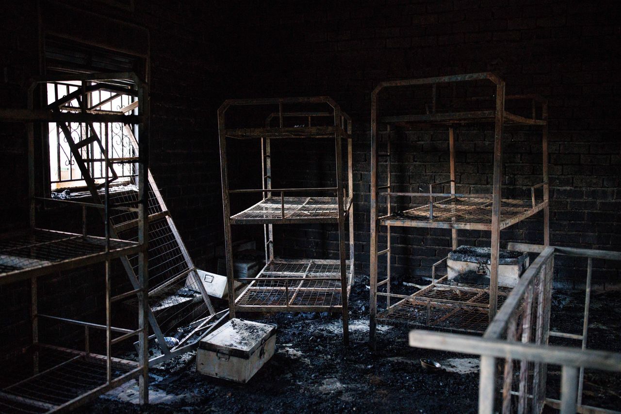 襲擊者縱火後的男生宿舍內,可見燒燬的雙層牀和個人物品。圖片來源:Luke Dray/EFE/ZUMA Press軍事指揮官奧盧姆週六表示,5至10名襲擊者通過窗户向男生宿舍投擲汽油彈,隨後掃蕩學校其他建築,砍殺了20名女學生。
