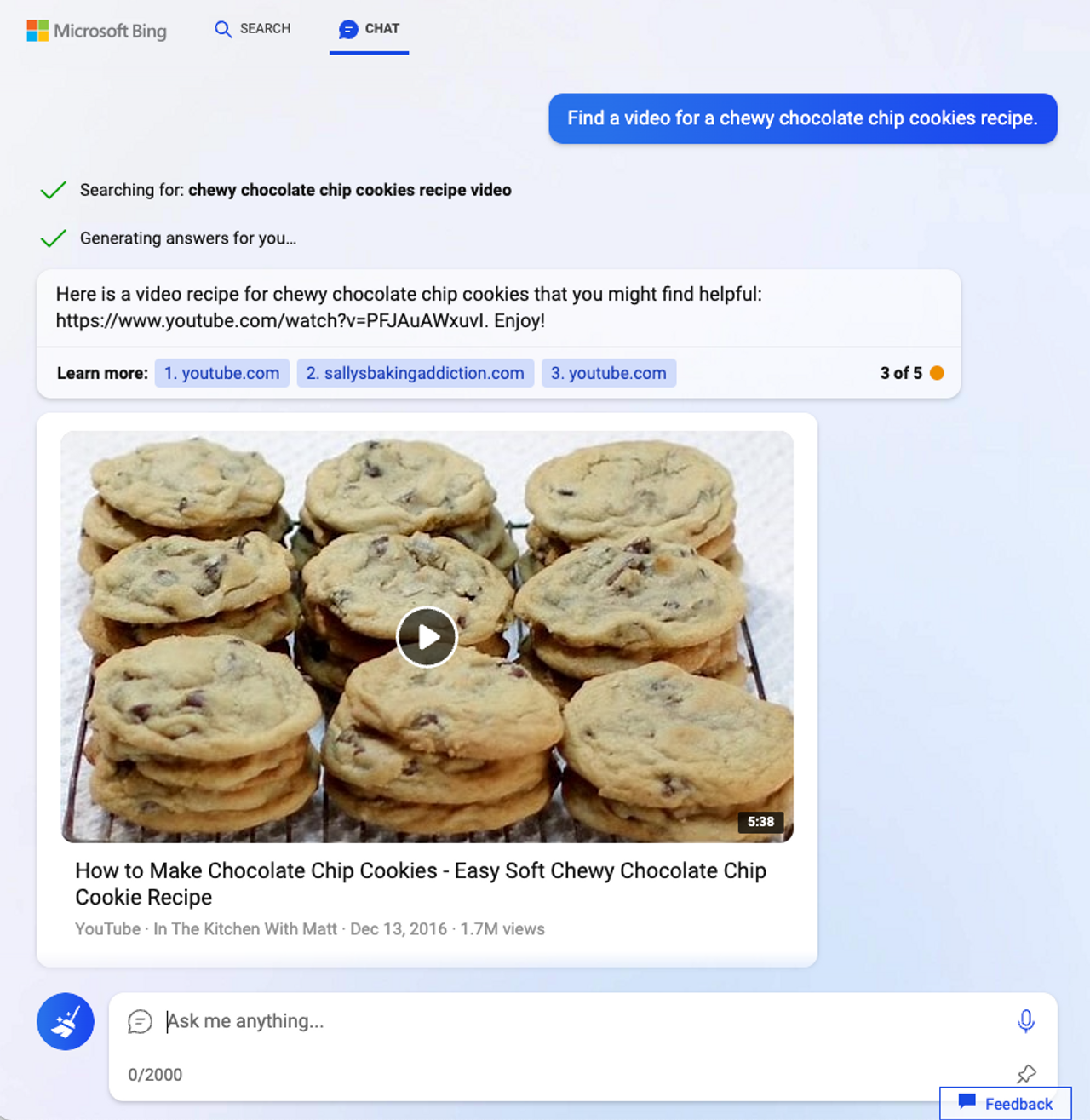 微軟的必應聊天可以在回覆中包含多媒體內容,例如YouTube視頻。#### 谷歌的Bard