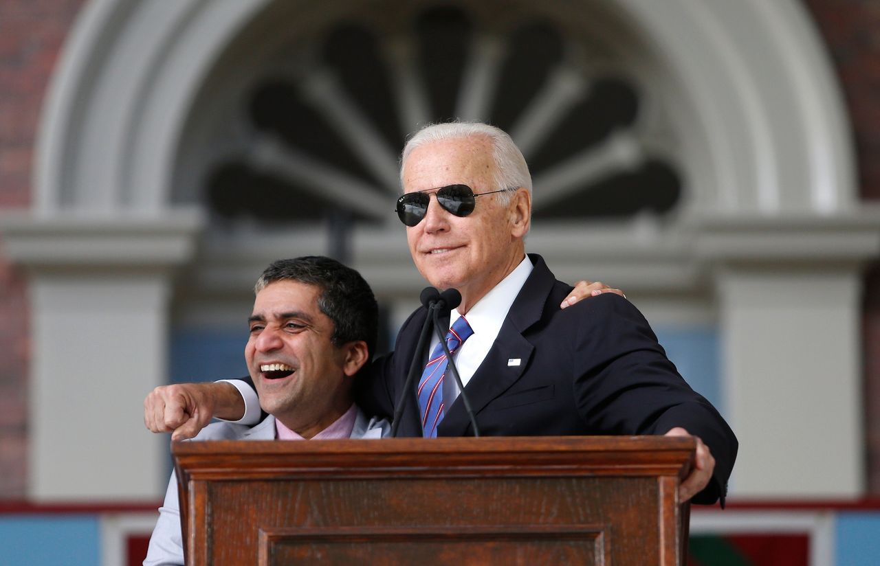 時任美國副總統喬·拜登在校園參加班級日活動時與哈佛學院院長拉凱什·庫拉納開玩笑。圖片來源:傑西卡·里納爾迪/《波士頓環球報》/蓋蒂圖片社哈佛大學管理層正面臨如何營銷其品牌的挑戰,這並不令人意外。