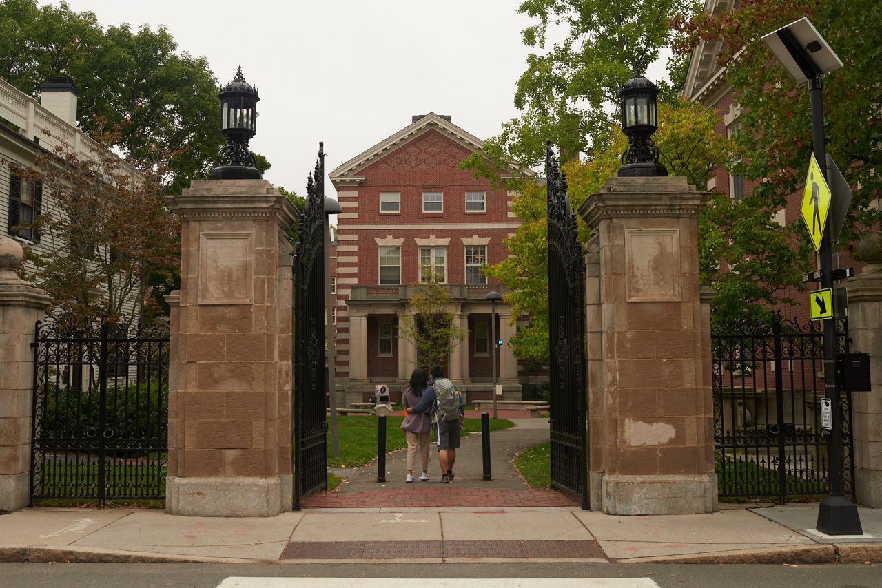 學生們穿過位於劍橋市的哈佛大學外門。圖片來源:菲利普·基思/《華爾街日報》去年12月,《哈佛深紅報》將"H炸彈"一詞收錄進《(非)官方哈佛詞典》。