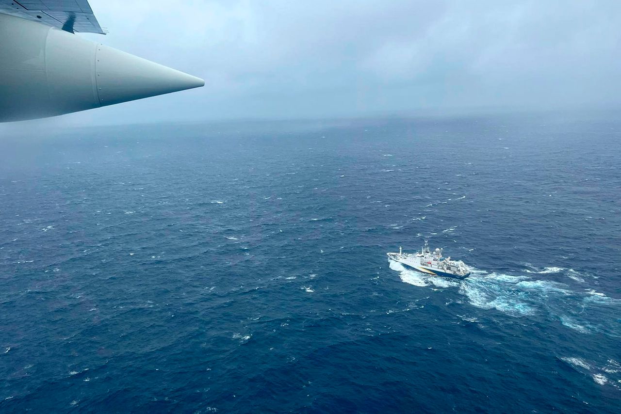 週三,一架海岸警衞隊飛機飛越法國科考船"亞特蘭大號",參與搜尋"泰坦"號潛水器。圖片來源:美國海岸警衞隊/美聯社美國在二戰後研發了聲學探測系統,用於監測大西洋和太平洋海域的敵方潛艇活動。