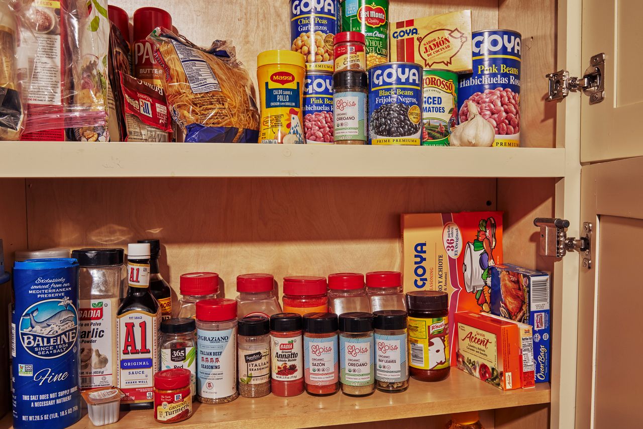 **我的食品儲藏室裏常備:**各種調味料。必須有戈雅調味粉(Goya sazón)和用於豆飯的火腿風味調料包——雖然有趣的是這種火腿味調料其實是素食的,但它能增添獨特風味。阿斗波調味料(adobo)也是必備,還有薩爾奇瓊香腸、超大袋裝卡羅萊納米以及大量罐裝豆子。我儘量儲備那些快捷方便的食材,幫助我快速做出地道的拉丁風味。如果來不及現做索夫rito調味底料,我會偷懶用罐裝的,比如費利西亞諾的波多黎各風格索夫rito就很不錯。做西班牙風味海鮮飯時,我會用罐裝蝦或章魚連同裏面的汁水一起煮,味道非常濃郁。只需加入大蒜和一點罐裝索夫rito,二十分鐘就能做出家鄉的味道。這些罐裝食品伴我長大,偶爾依賴它們我並不覺得難為情。