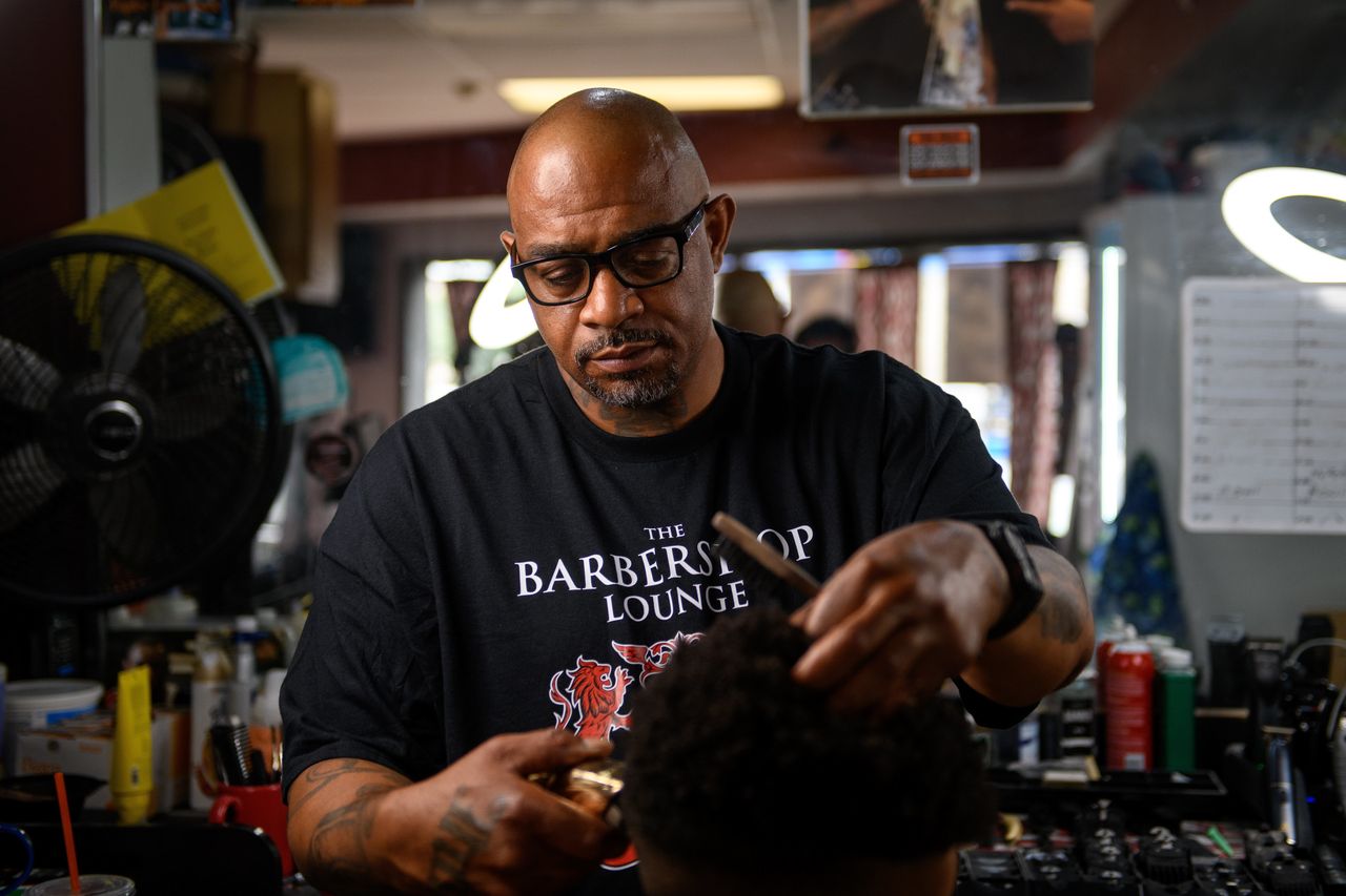 卡里·邁納在費城的理髮店為10歲的納西姆·厄普舒修剪頭髮。圖片來源:克里斯頓·傑·貝塞爾為《華爾街日報》拍攝