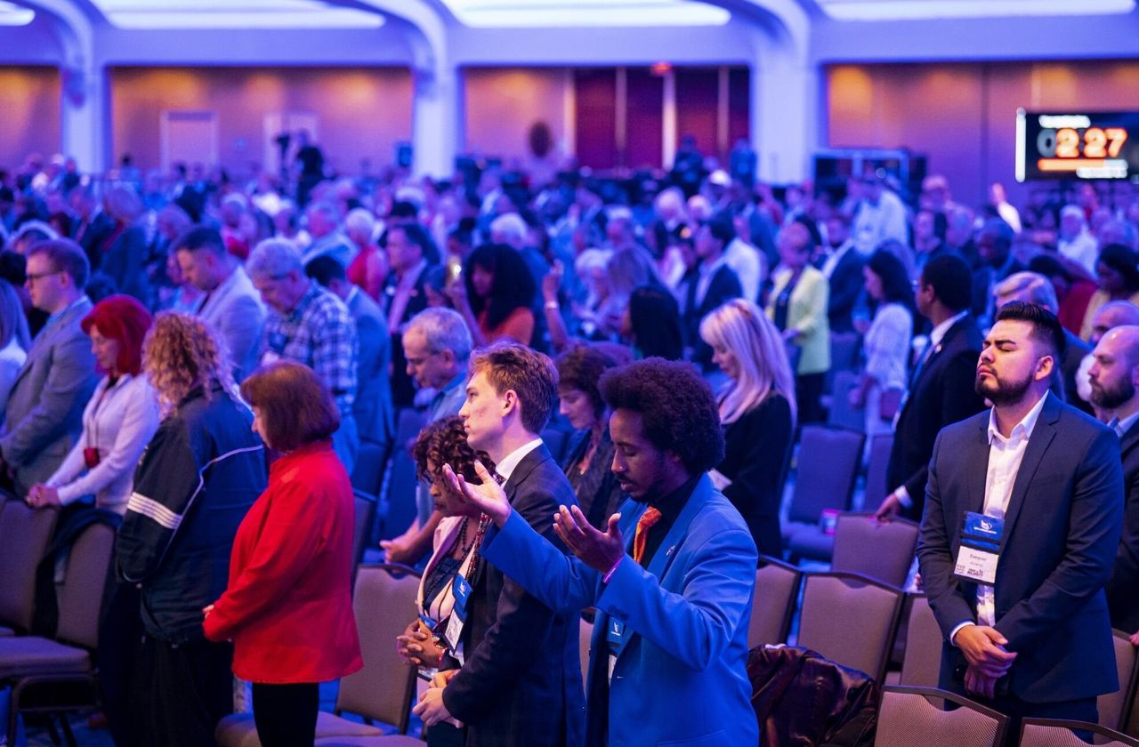 週五,參加華盛頓保守派與基督教活動家大會的與會者正在祈禱,這場會議彙集了多位共和黨總統候選人。圖片來源:阿爾·德拉戈/彭博新聞社其他幾位候選人——如阿肯色州前州長哈欽森、邁阿密市長蘇亞雷斯、南卡羅來納州參議員斯科特——獲得的掌聲則顯得禮貌或冷淡。