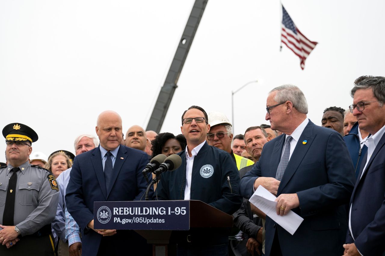 州長喬什·夏皮羅週五在費城95號州際公路重新開放儀式上講話。圖片來源:喬·蘭貝蒂/美聯社拜登表示:“我們將提供一切所需,確保永久性修復工作順利進行。”