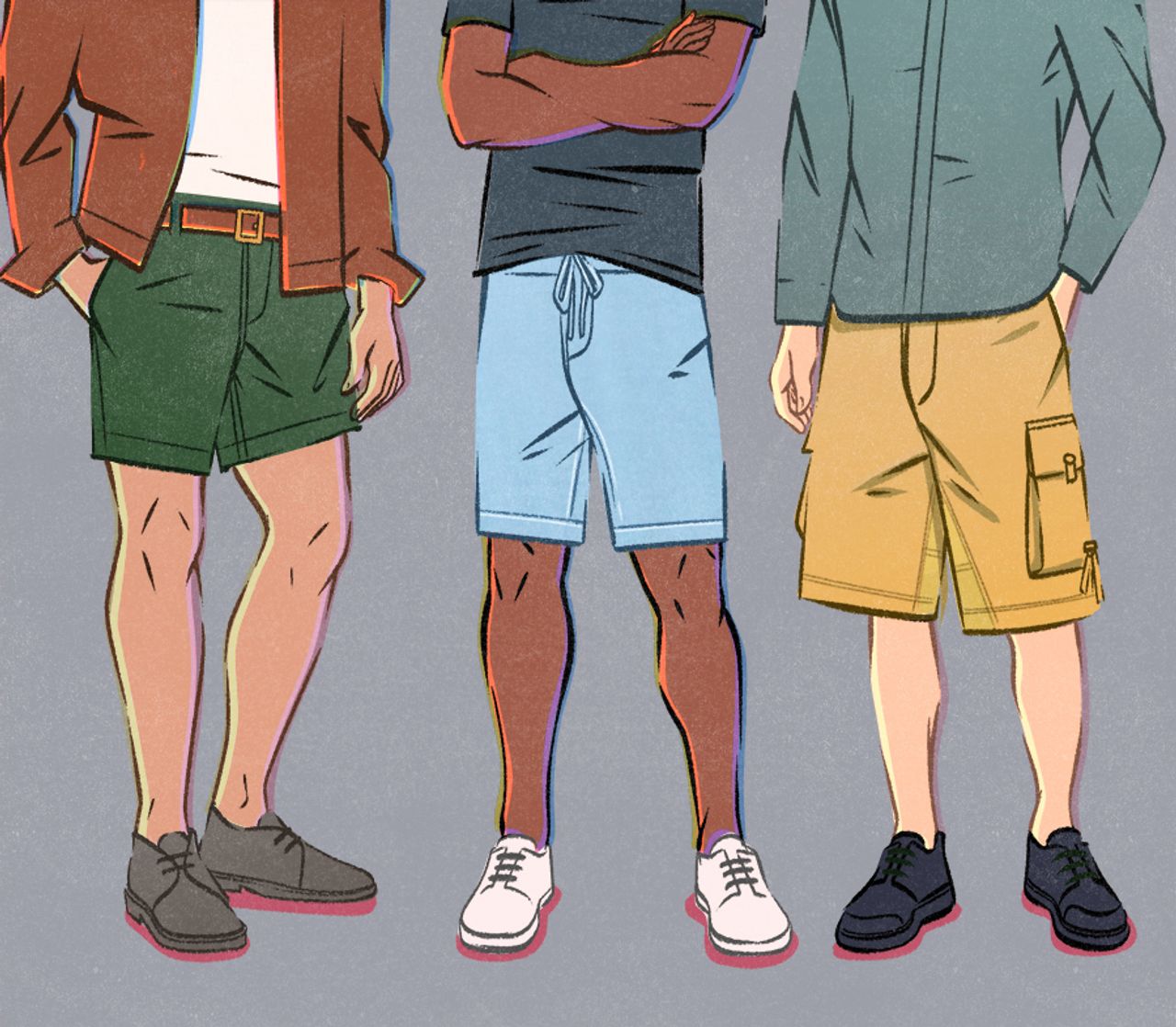 插圖:保羅·圖勒選購短褲時請牢記“金髮姑娘會怎麼做?”:**64%的受訪者認為“剛好過膝”的中等長度最性感,而超短款及過膝款分別只獲得19%和17%**的慘淡票數。